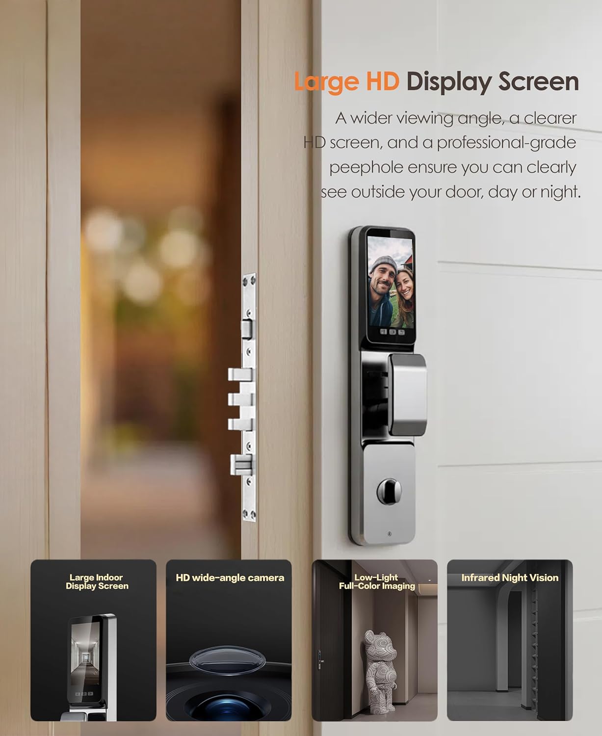 【4.5″ HD SCREEN & 1080P VIDEO DOORBELL WITH REAL-TIME ALERTS】All-in-one smart deadbolt integrated with 4.5-inch HD indoor display and professional video doorbell. Elders and kids can view real-time visitor footage directly via the large screen, verifying identity before unlocking for maximum safety. 1080P wide-angle camera supports remote live view via Tuya Smart App, with motion-activated instant push alerts and 2-way audio for remote communication with couriers, guests and delivery drivers.