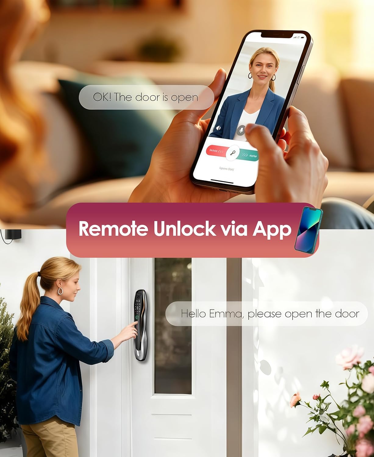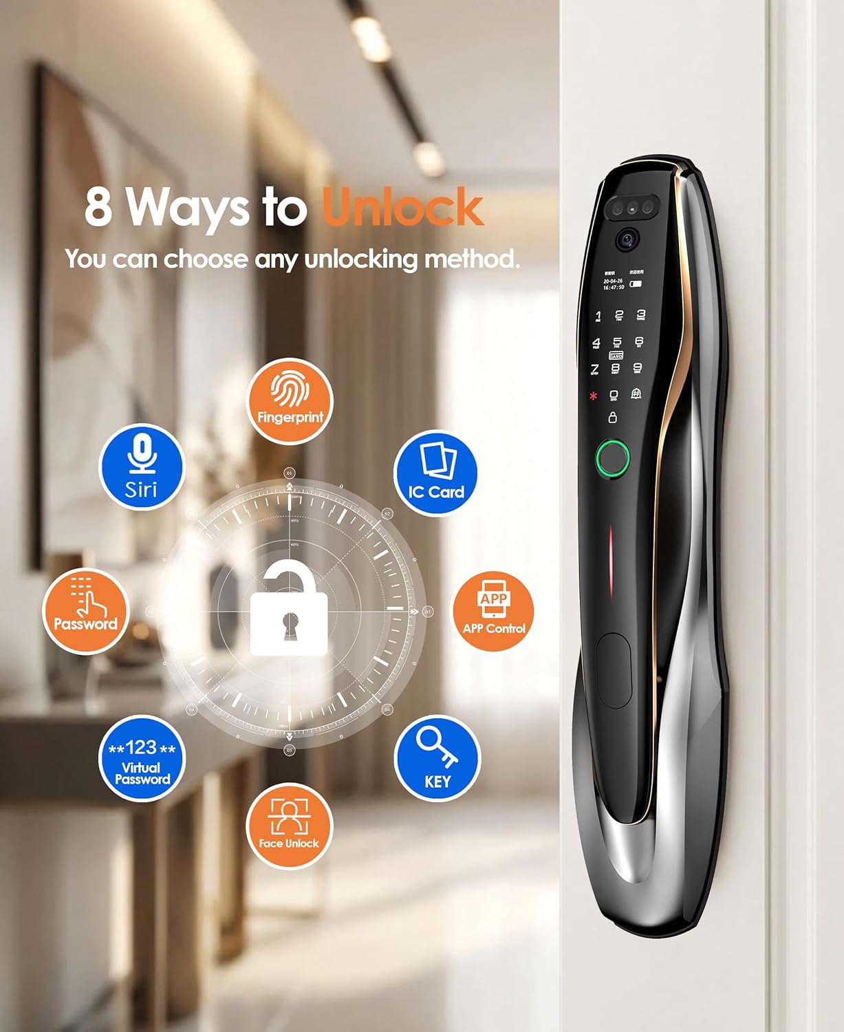 【7-IN-1 FLEXIBLE UNLOCK & SMART ACCESS MANAGEMENT】Versatile keyless entry methods fit all user scenarios: 3D Face Unlock, <0.3s Biometric Fingerprint, Anti-Peeping Virtual Passcode, Encrypted IC Card, Tuya App Remote Unlock, Time-Limited Temporary Passcode, and Mechanical Backup Key. Ideal for multi-generational families, Airbnb hosts, rental property managers needing customizable access permissions.