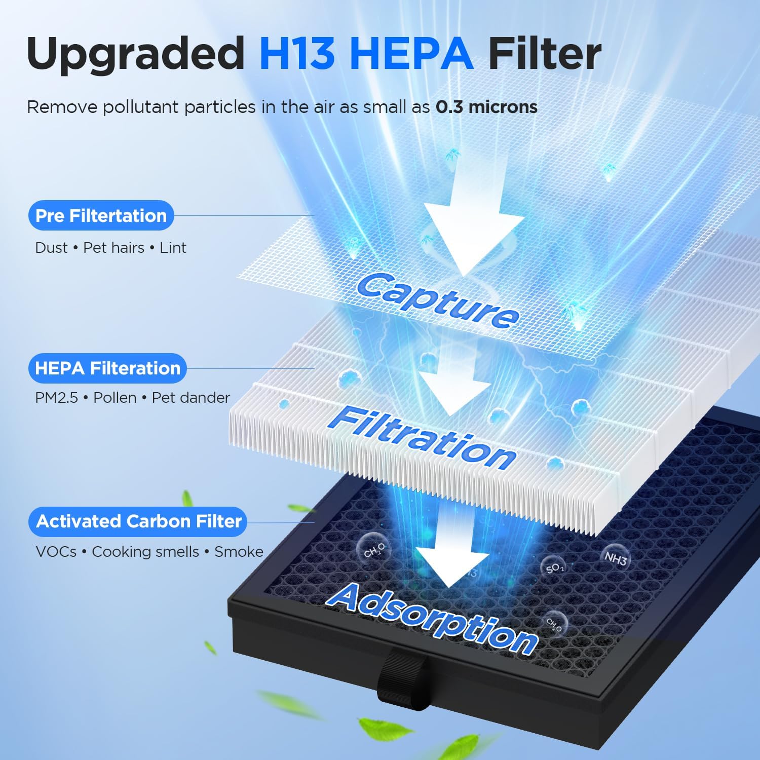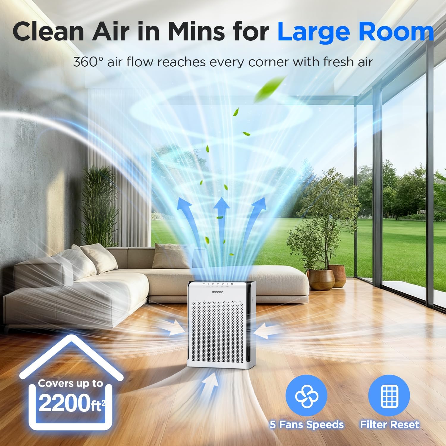 3D AIR INTAKE & HIGH PERFORMANCE:This is the 2025 latest MOOKA M200L HEPA air purifiers for home large room. To maximize airflow for faster purification, our large room air purifier is designed with triple-sided air intake system and has a larger coverage area up to 2200 ft², that can effectively captures air pollutants such as pet hair, dander, smoke, and odors in spaces like bedrooms, offices, dorm rooms, and basements