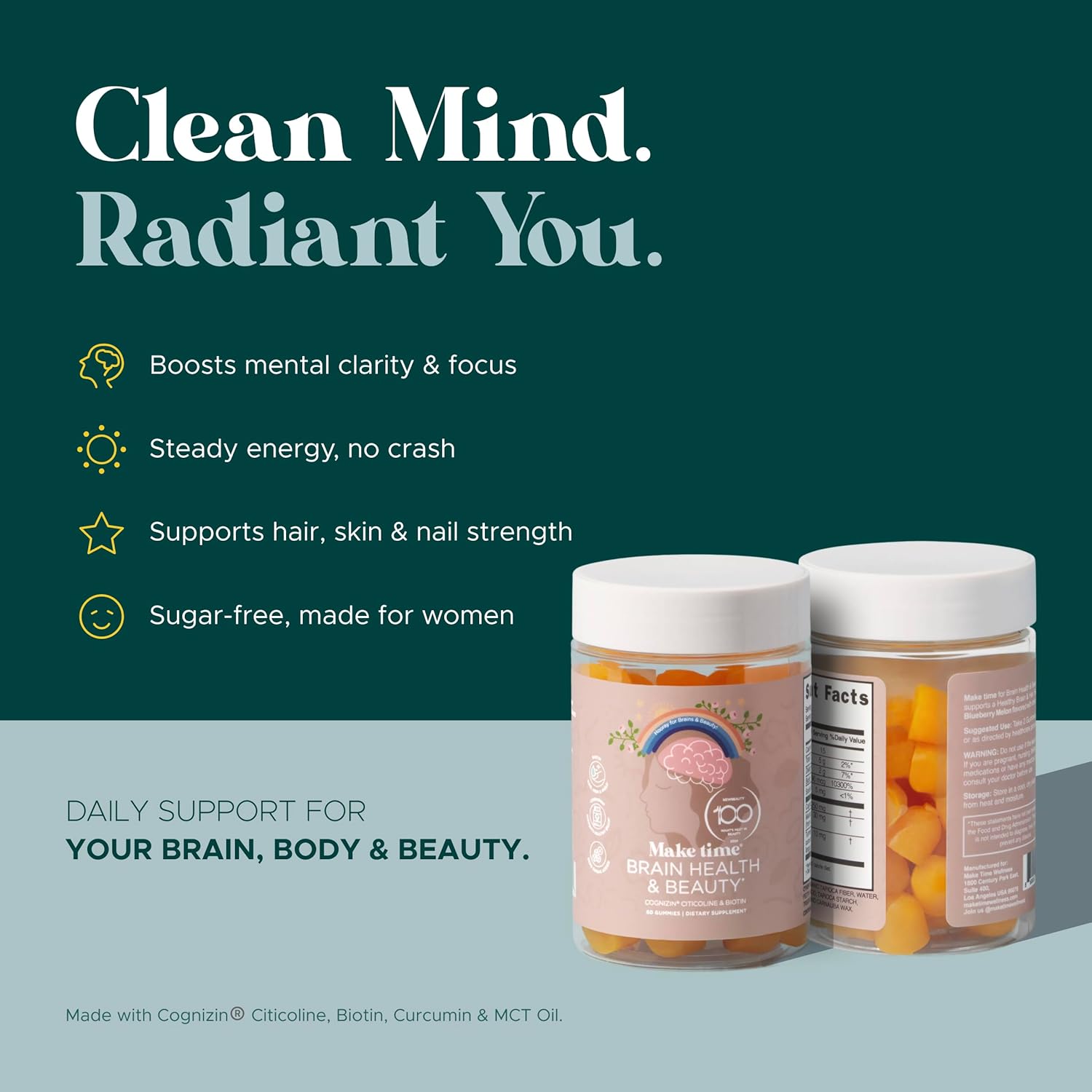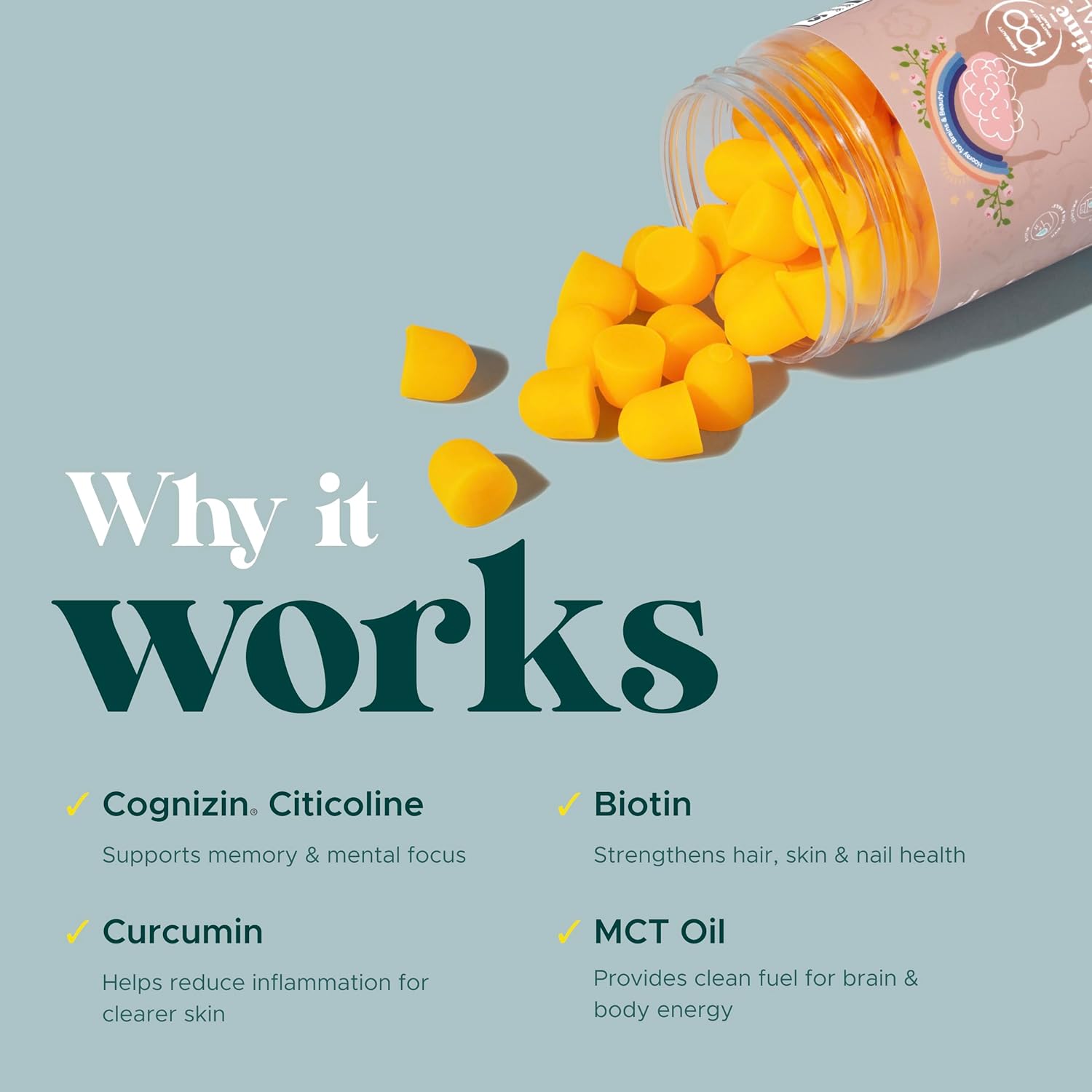 EASY DAILY ROUTINE – Just 2 plant-based gummies per serving provide brain health nutrients and beauty support in one convenient supplement.