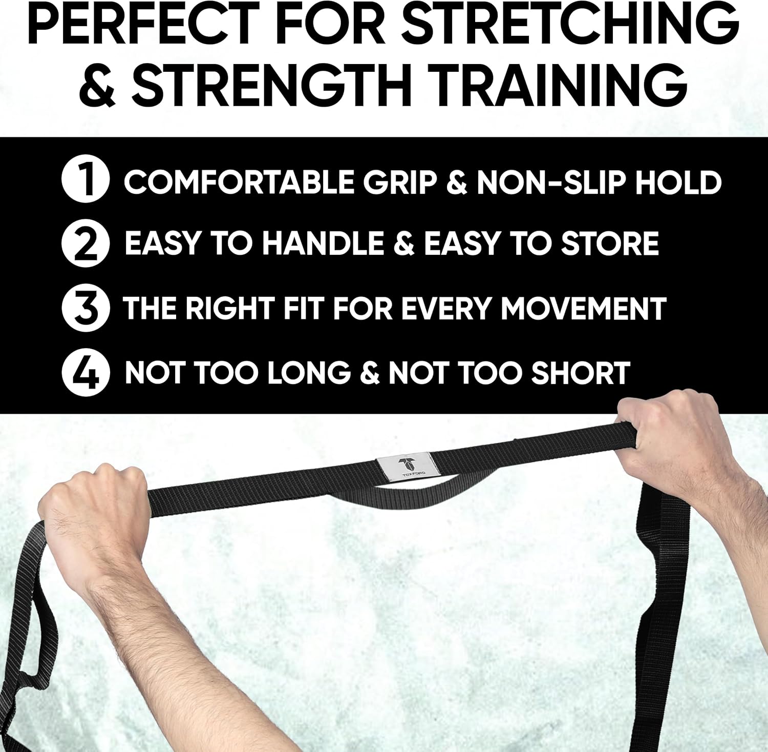 Choose a strap that matches your height and flexibility. Therefore TOXFORD Straps with 10 built in loops (75 inches Length) accommodate different stretch levels and body sizes. Non-slip texture ensures secure grips and stable positioning.