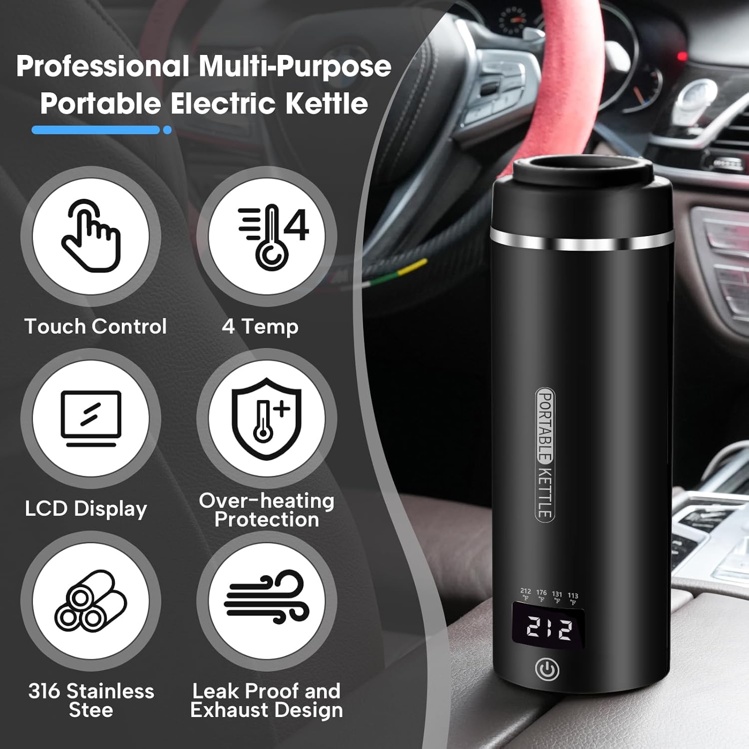 12V Travel Electric Kettle for Car Portable Small Mini Tea Coffee Kettle Water Boiler, Water Heater with 4 Temperature Control (Black)