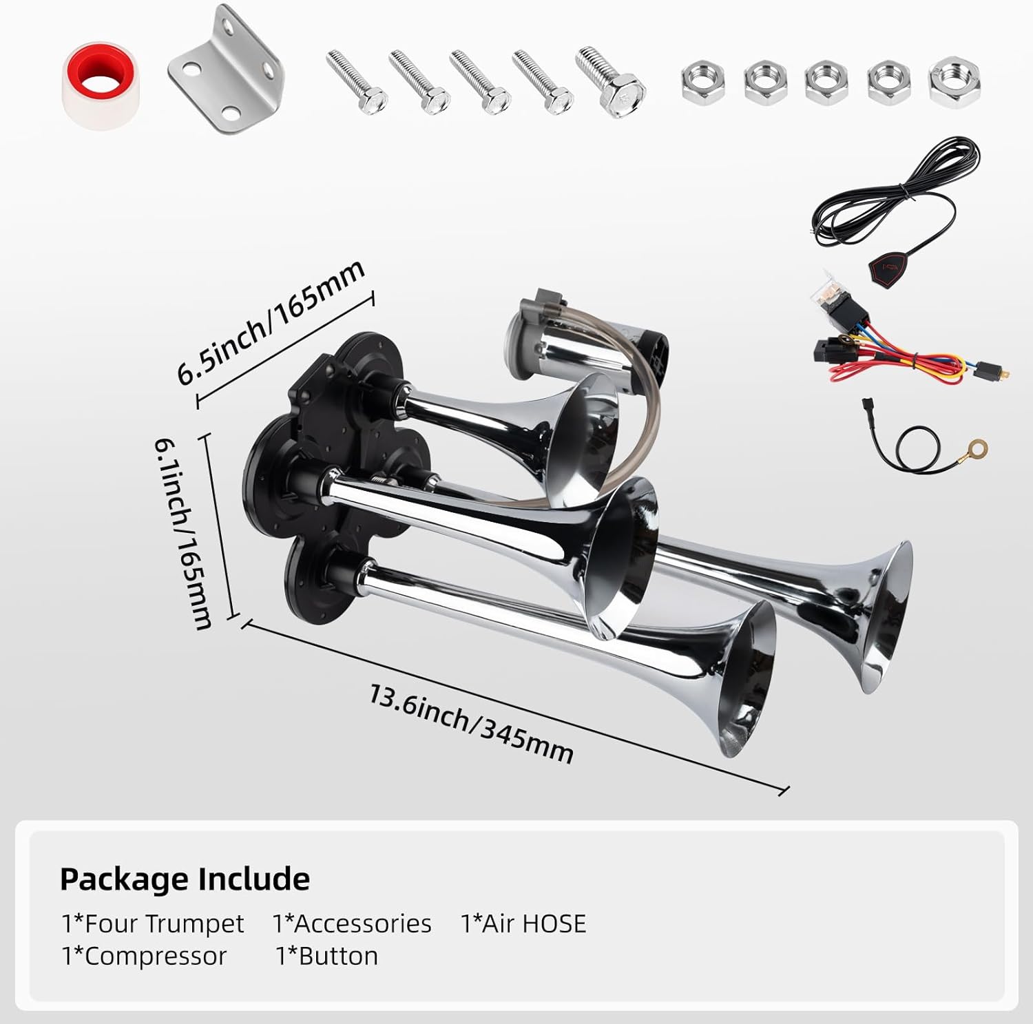 Package Content: 1 x 150db 12V Train Horn Kit Air Horn With Compressor.This train horn for cars is easy to install with all mounting hardware included. It is flexible and portable, so you can easily detach it from one vehicle to another.