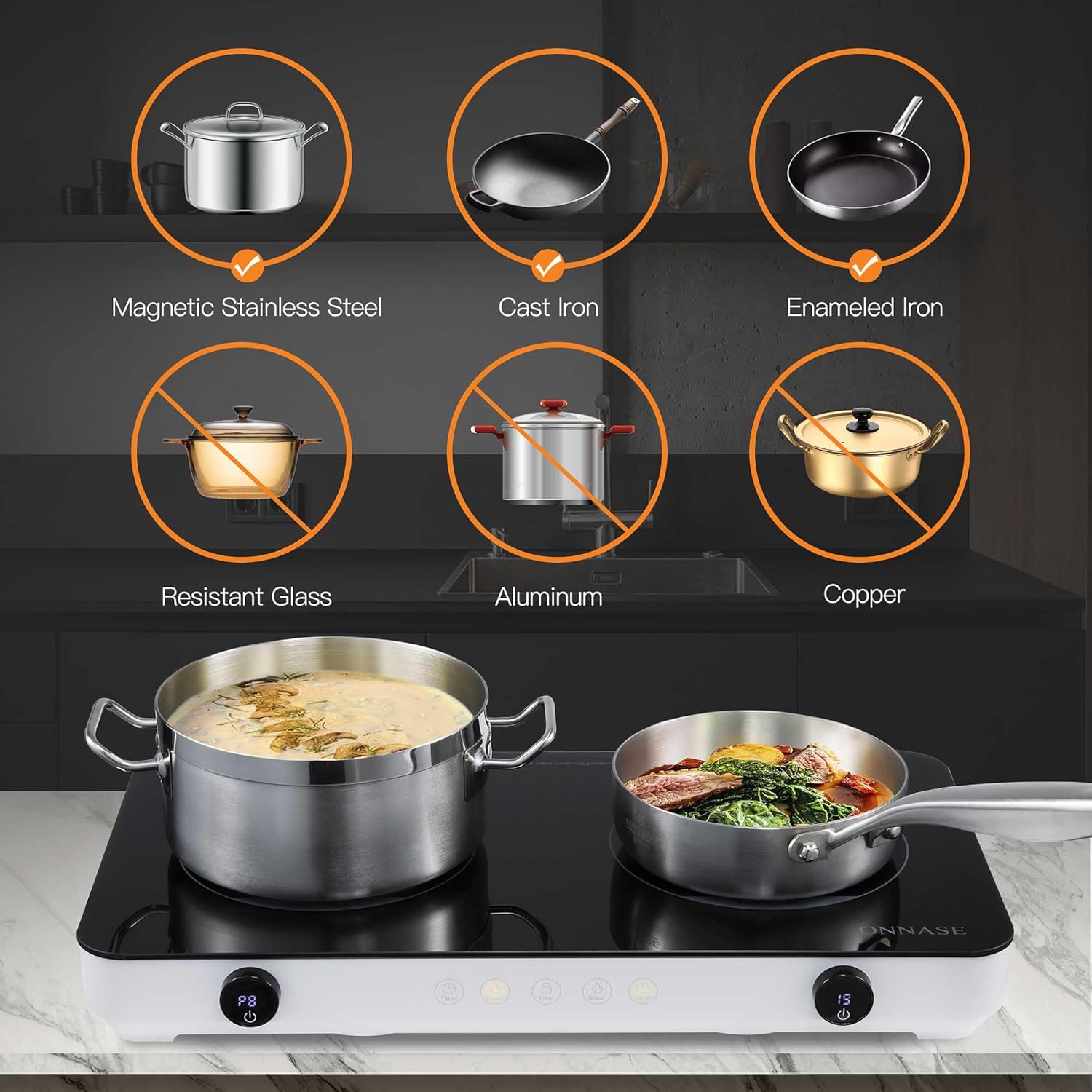 Wide Range of Applications & High Efficiency: This two-burner portable electric stovetop (18.1″ (D) x 10.2″ (W) x 2.4″ (H)) is perfect for both home and outdoor cooking. With a temperature range of 104°F to 580°F and 8 power settings ranging from 600W to 1800W, you can easily select the ideal setting for your cooking needs. It is compatible with cookware such as cast iron, enameled steel, and magnetic stainless steel, as long as the base diameter is greater than 4.49 inches.