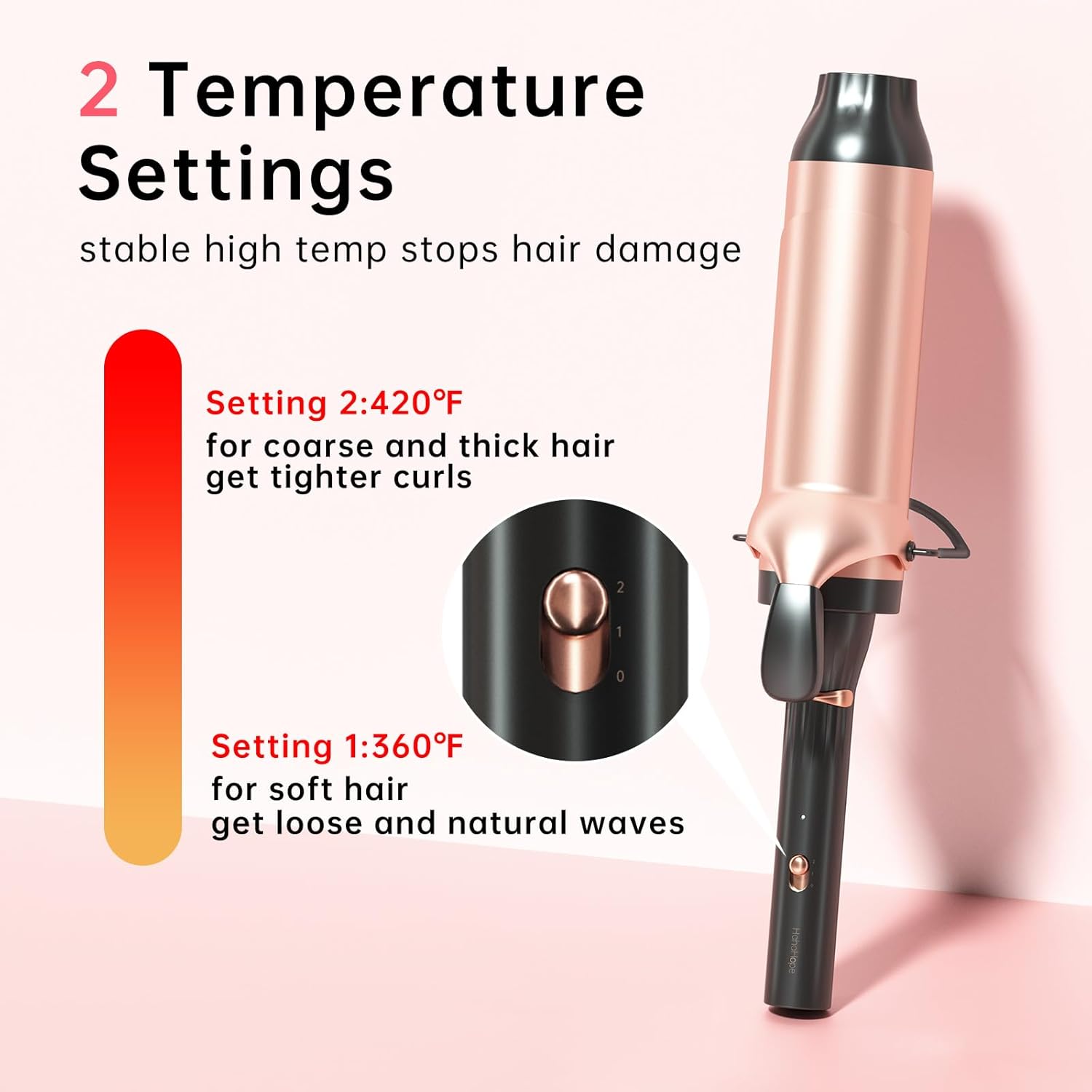 30-second fast preheat—cuts morning prep time. This big barrel curling iron’s stable high heat prevents re-heating damage, while 2 temperature settings( 360℉&420℉) fit all hair types for quick, healthy styling.