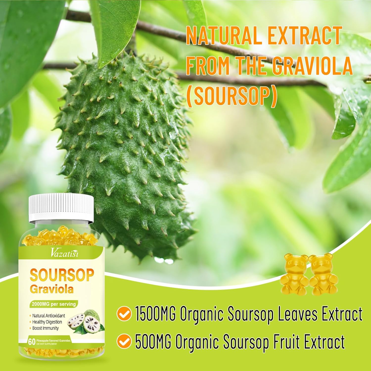 [ Natural Graviola Leaf & Fruit Gummies ] Graviola (Soursop) is a tropical plant used for centuries in traditional wellness practices. Our Soursop gummies are made with premium graviola fruit and leaf extract, providing a nutritious and delicious option. We added vitamin C and magnesium to improve its overall effectiveness and utilization.