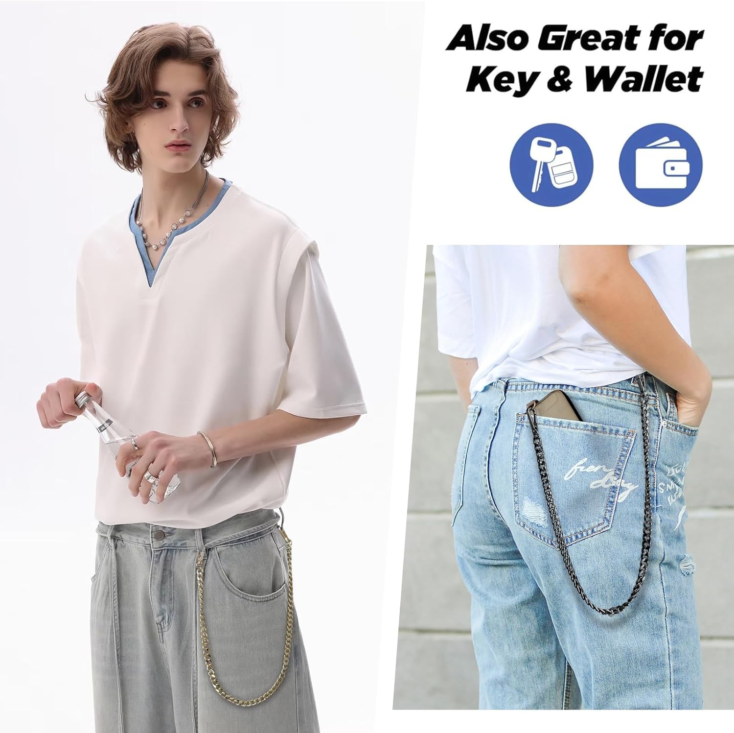 đăFashion Accessoryă Our pants jean chains for men is perfect for motorcycle riders, hip-hop players, rockers, truckers, bikers and people who like gothic style.đăEasy Installationă Pass the patch directly through the charging hole of your phone case. Then insert your phone and connect the eyelet of the patch to the lanyard hook. Place your phone inside, and secure the phone chain clasps! Package Contents: Spring Ring Ă1 / Transparent Patchs Ă3 / Phone Chain Ă2 / Cell Phone Stand Holder Ă1