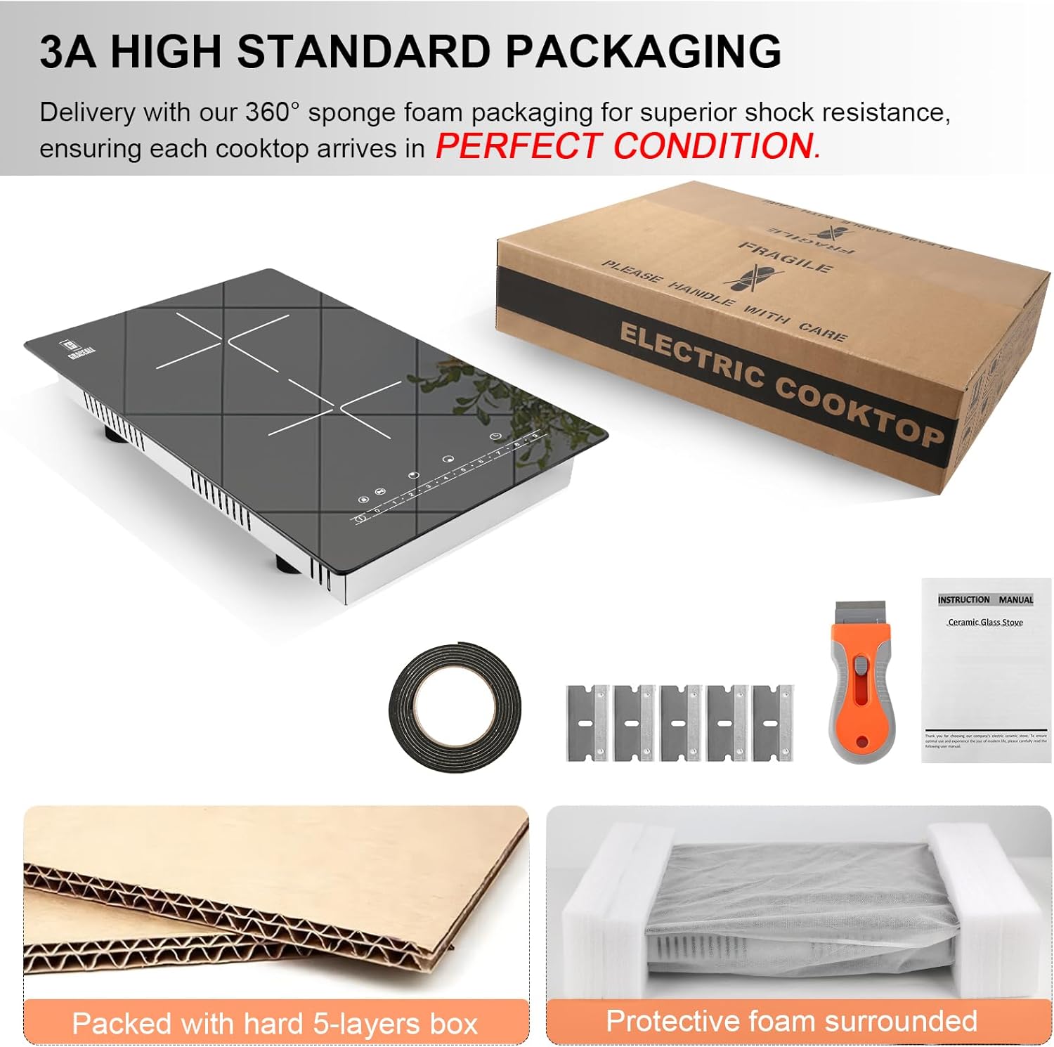 2000W 2 Burners Electric Stove 12 inch Infrared HotPlate for Cooking, Plug in Hot plates Double Heating Elements Cooktop, 120V Ceramic Hotplate, Built-in and Countertop Compatible