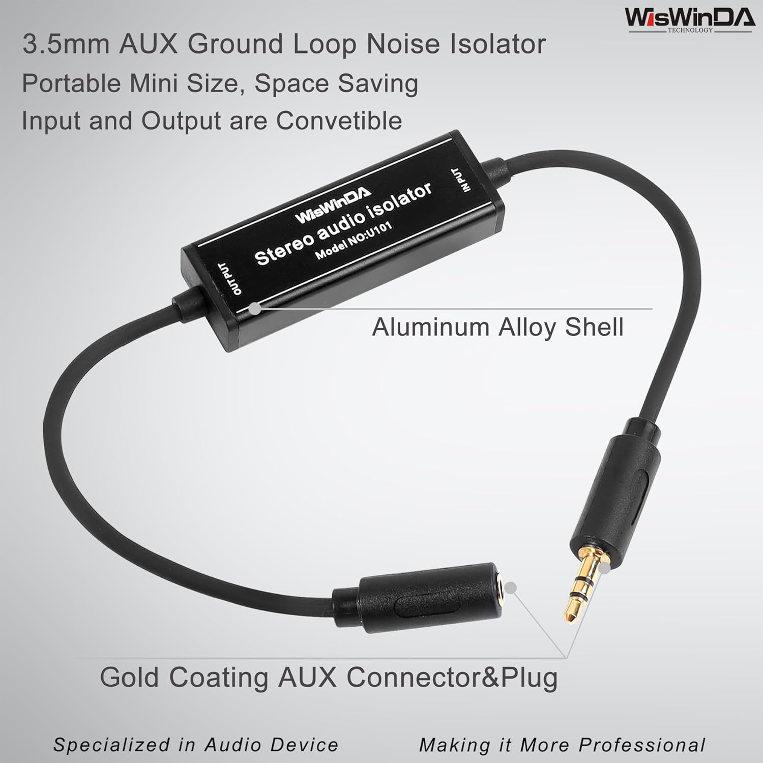 WisWinDa 3.5mm Aux Mini Noise Filter Aluminum Alloy Shell Ground Loop Noise Isolator for Car and Home Audio System Gold Coating AUX Hum Eliminator Gold coating 3.5mm Aux hum eliminator M&F connectorsPortable Mini size ground loop noise isolator more space savingPlug and play design audio isolatorSolving problems of the ground loop noises