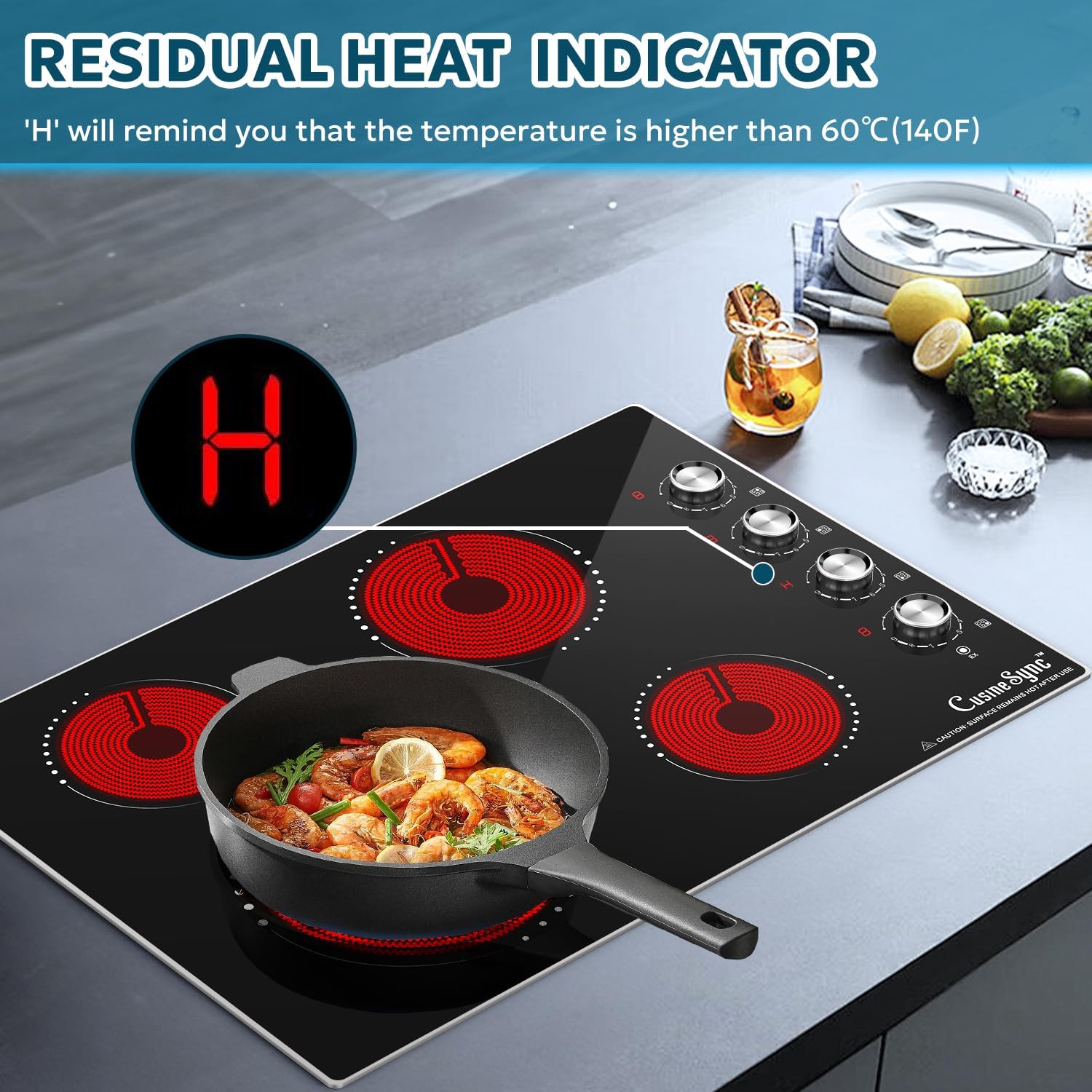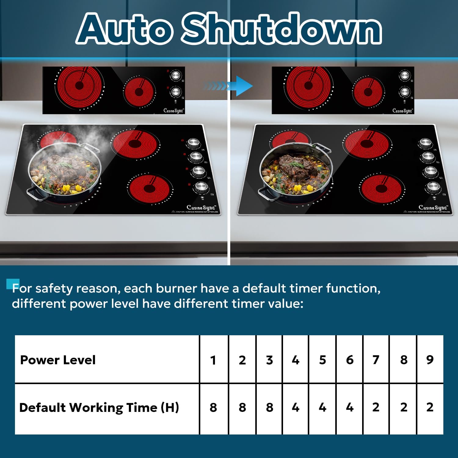 Safe and Harmless Electric Stove: Cusinesync electric cooktop is equipped with a high-temperature warning feature. If the display shows “H,” it indicates that the glass surface is very hot, reminding you not to touch it. Additionally, if the cooktop is accidentally turned on, it will automatically shut off after a certain period. It also features a touch control switch for the expandable zone