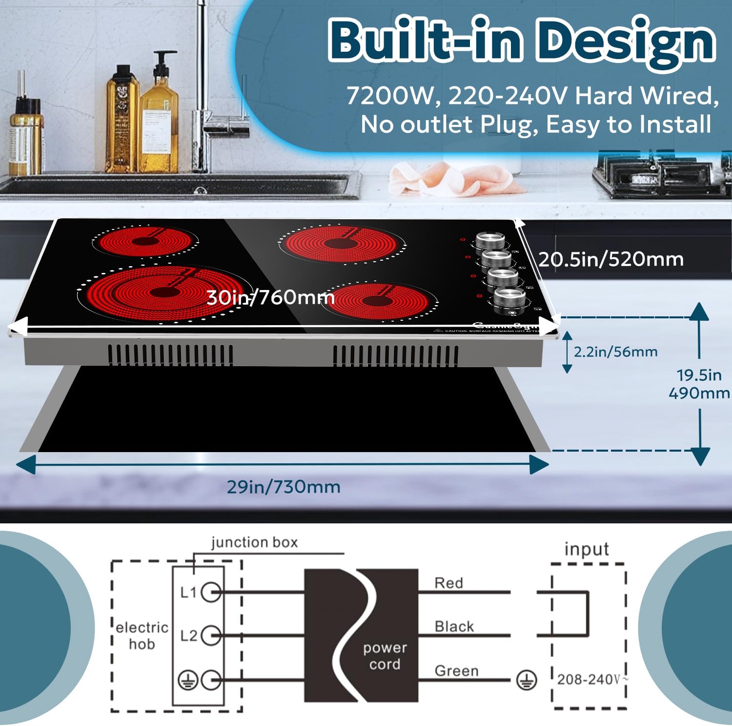 30 Inch Electric Cooktop, 4 Burner Built-in Electric Stove Top with 9 Power Levels, Knob Control, Auto shutdown and Residual Heat Warning, 7200W, 220-240V for Hard Wire