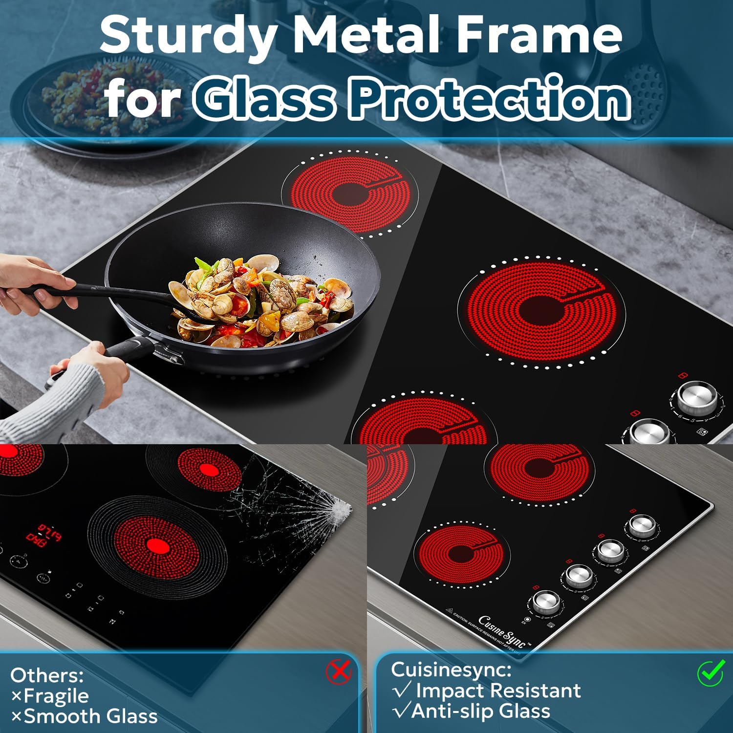 220V-240V Built-In Electric Cooktop: The Cusinesync 4-burner electric stove is designed for 220-240V systems and requires professional installation, as it comes without a plug. With a total power output of 7200W (3000W + 1200W + 1200W + 1800W), this cooktop delivers exceptional heating performance for all your cooking needs. Before purchasing, please confirm the dimensions to ensure it fits your kitchen. If you have any questions about the product, feel free to reach out to us