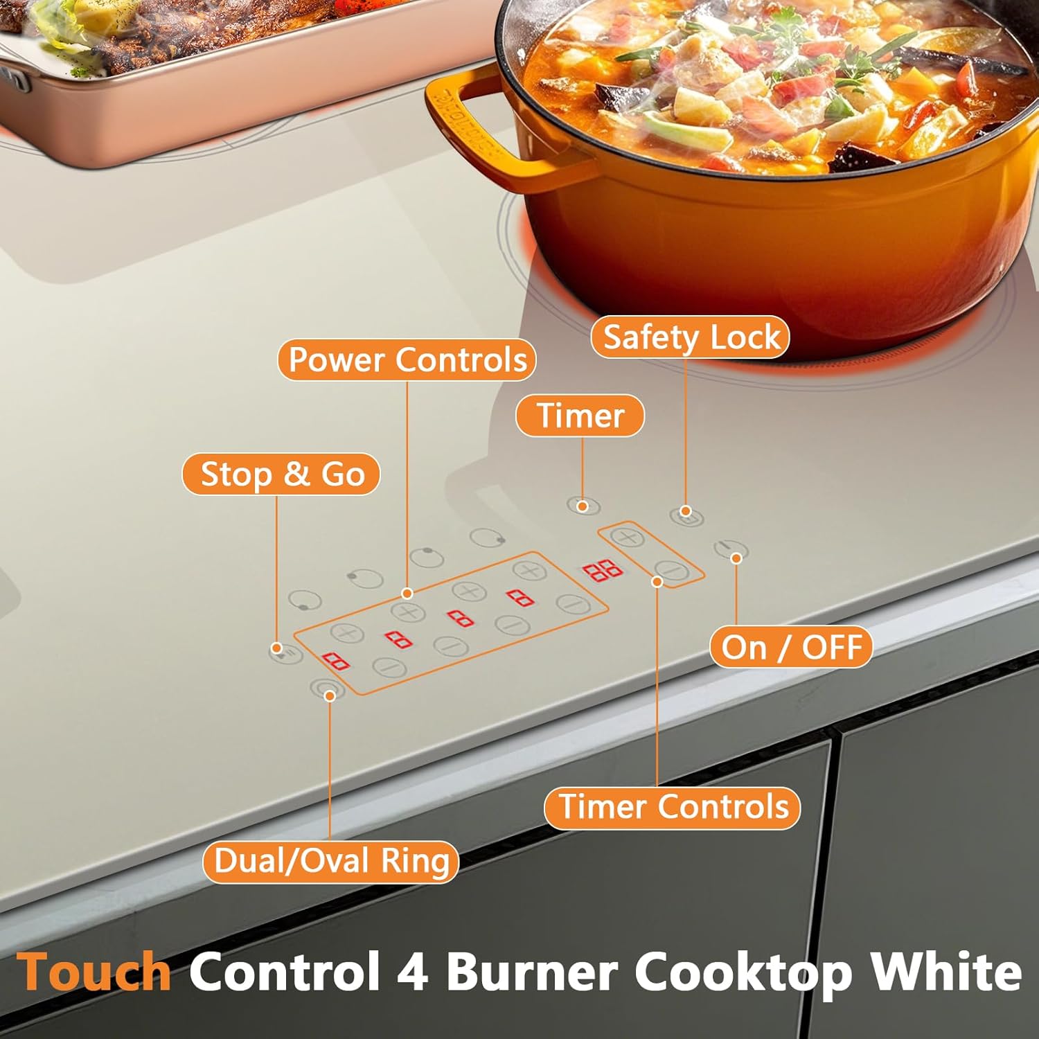 âĄă0-99 Mins Timer and Safety SystemăCome with a 0-99 Mins timer. This 30 inches white electric stove top will be shut off automatically after the time counts down. Besides the timer, Cooksir 4 burner ceramic cook top also features some functions like child safety lock, auto shut off, residual heat indicator and over heat protection. A safer option for households with children or pets.