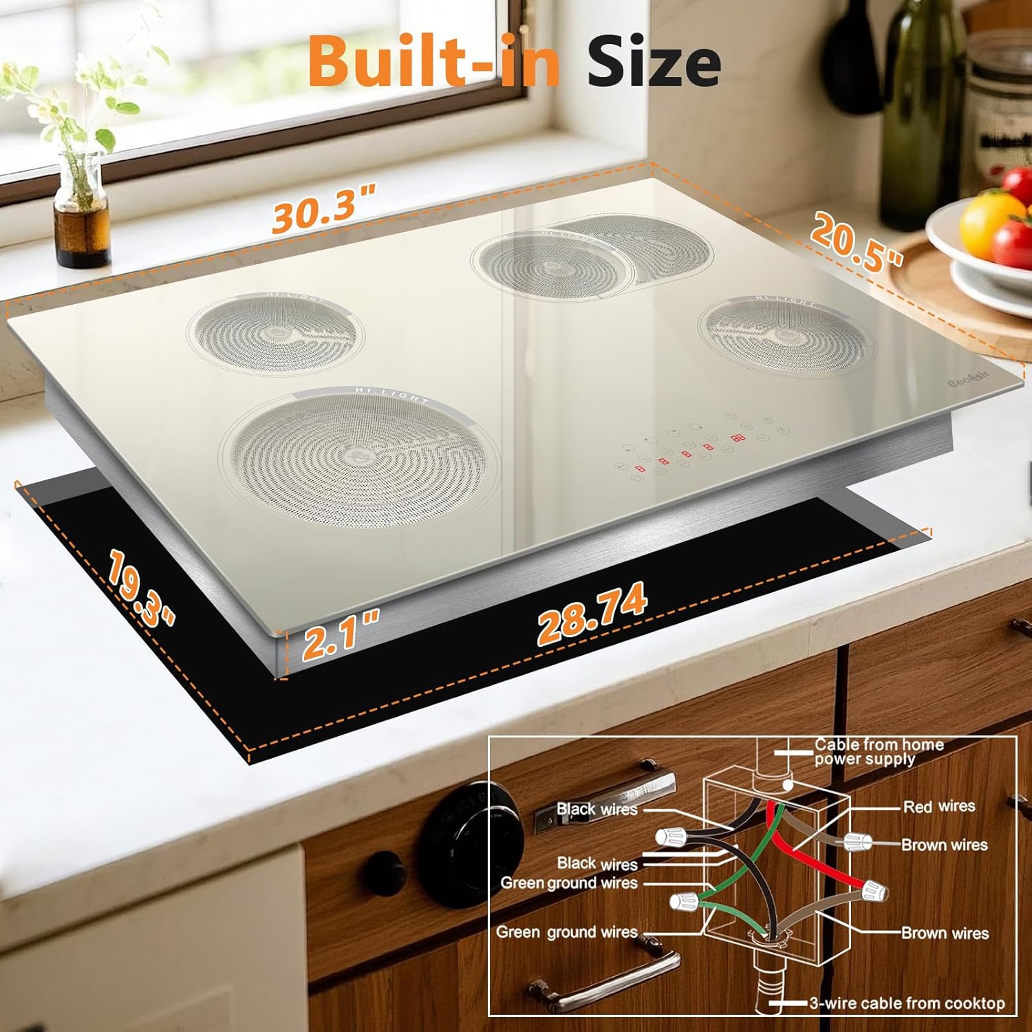 đ ăSuitable for All Types of CookwaresăCooksir 30 inches electric stove top can be used with any type of pans and pots in your home, such as aluminium pans, copper pans, cast iron frying pans and non-magnetic stainless steel pans. This cooktop 30 inch can heats cookware efficiently with minimal heat loss. Simply wipe with a clean cloth when cool. Product Size:30.3″L x 20.5″W x 1.73″H, Cut-out Size: 27.8″L x 19.3″W.