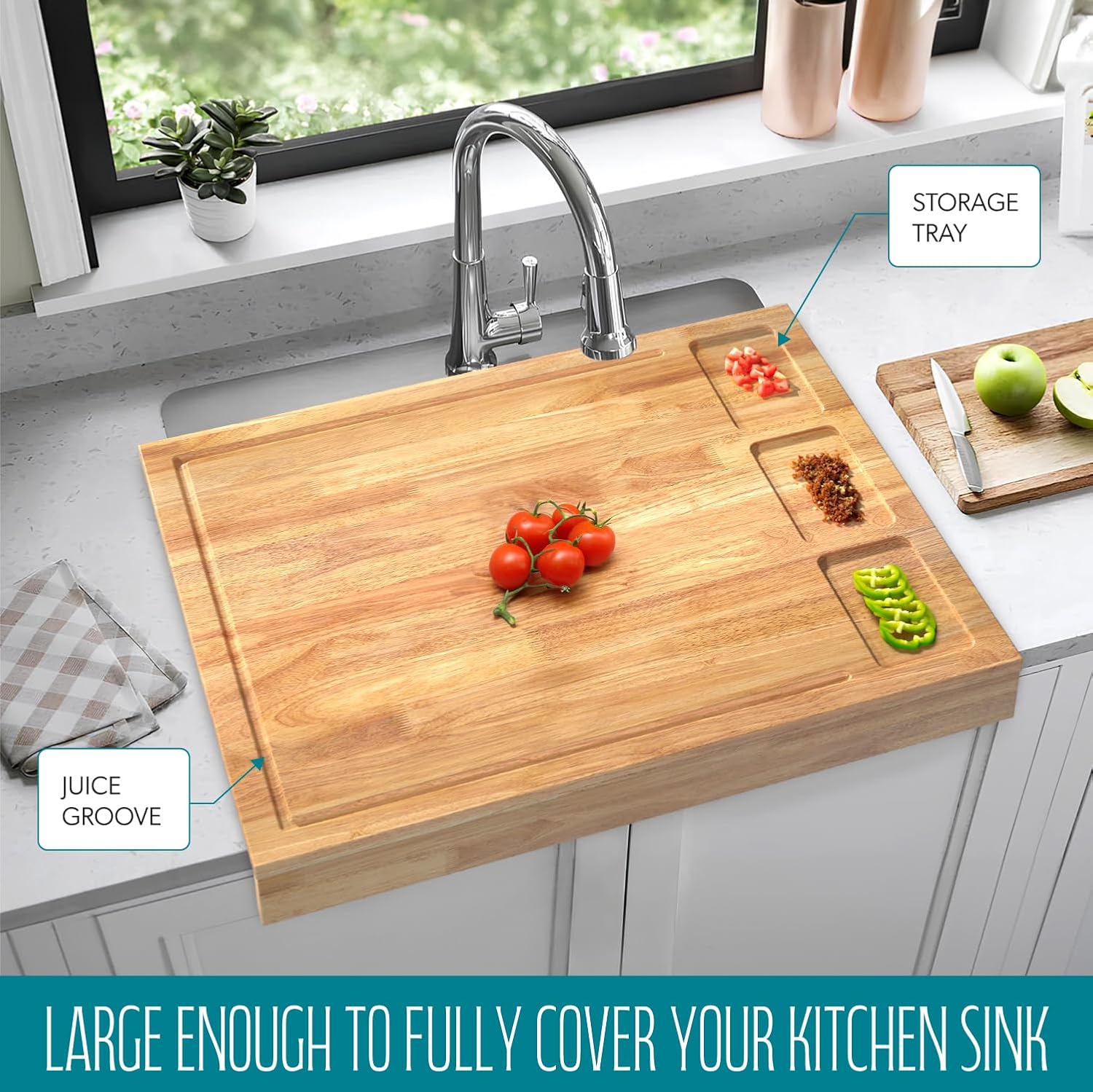 ✅ SMART DESIGN, MULTIPURPOSE: The front side features a new design with an expertly carved juice groove around one edge to catch runaway liquids. The backside can be used as a serving tray for meats, cheese, bread, vegetables, fruits, crackers, and sliced baguettes.