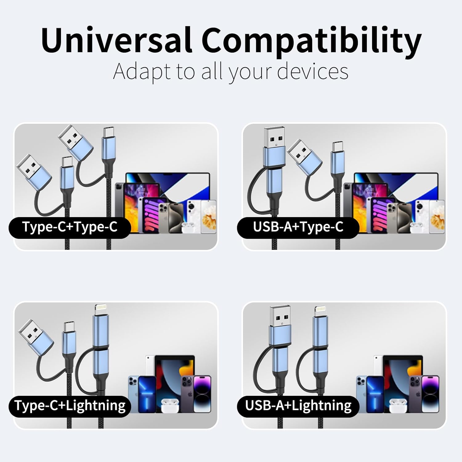 4 in 1 Cable Design: It combines four modes-USB A to C, USB A to Lightning, USB C to Lightning and USB C to USB C in one cable. 4-in-1 usb charging cable made of high-quality aluminum alloy and durable nylon braiding, effectively extend its service life