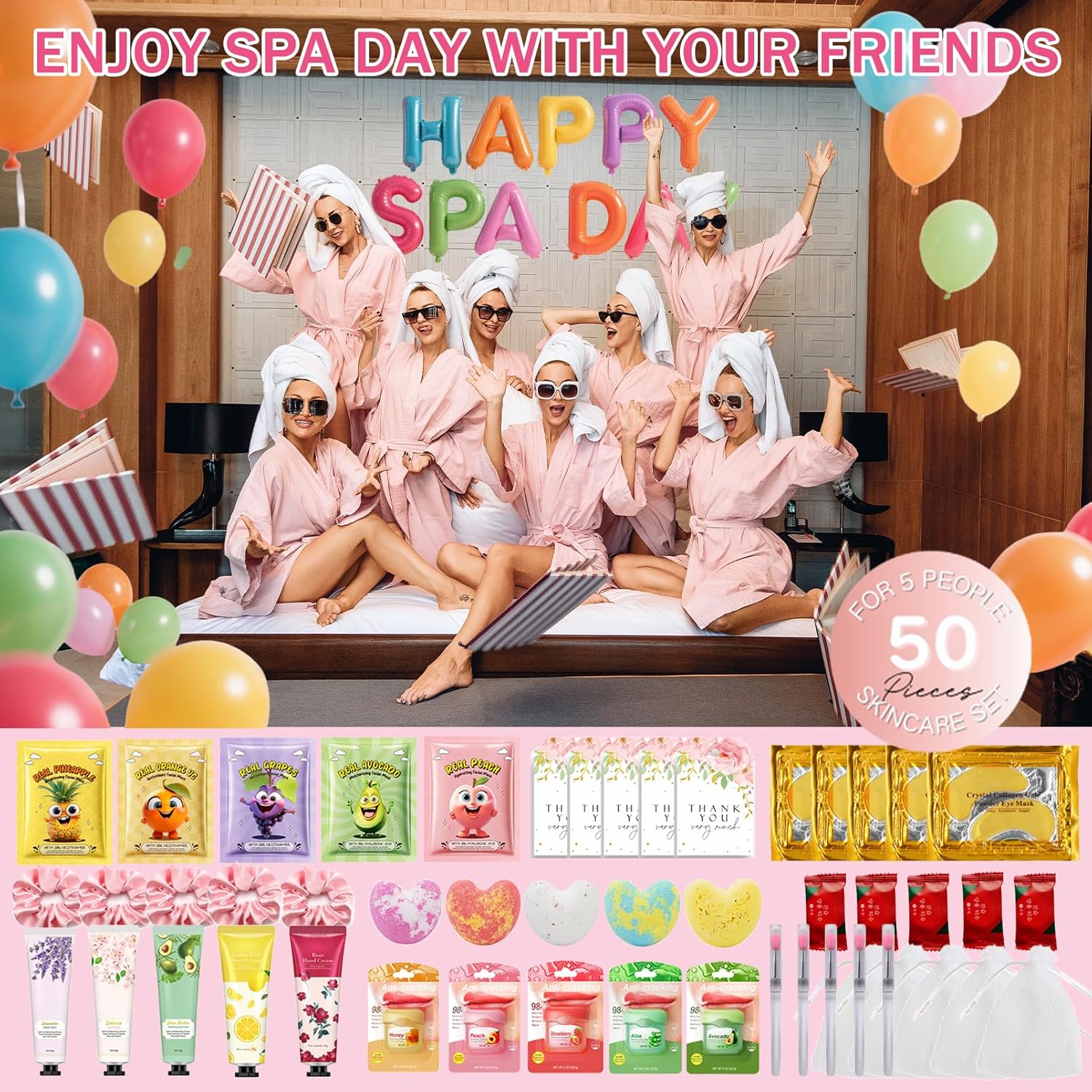 50 PCS Spa Party Supplies for Girls & Women, Facial Masks- Hand Cream- Lip Balm- Bath Bomb- Eye Mask- Compressed Towel- Hair Ties- Lip Brush- Organza Bags, Spa Kit for Birthday, Sleepover, Spa Day