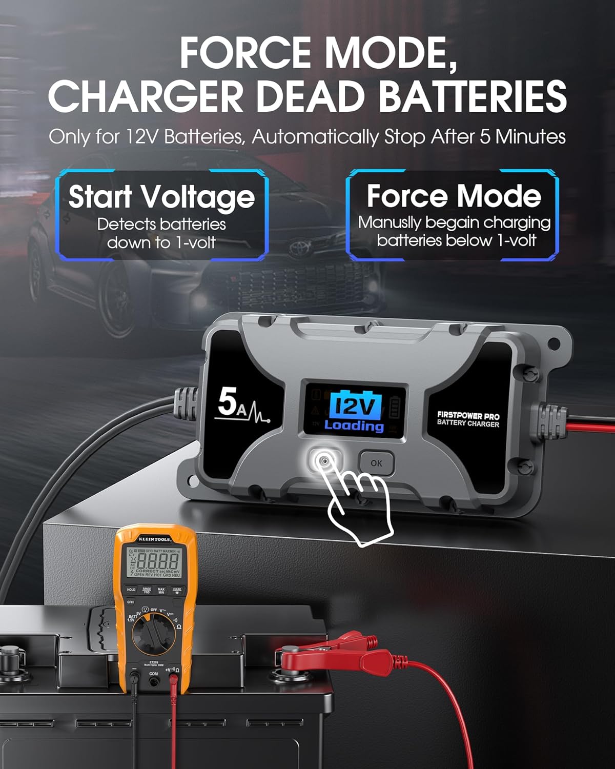 【CHARGES DEAD BATTERIES】Charges batteries as low as 1-volt. Or use the all-new force mode that allows you to take control and manually begin charging dead batteries down to zero volts. FORCE MODE charging 5 minutes will reactivate your battery.