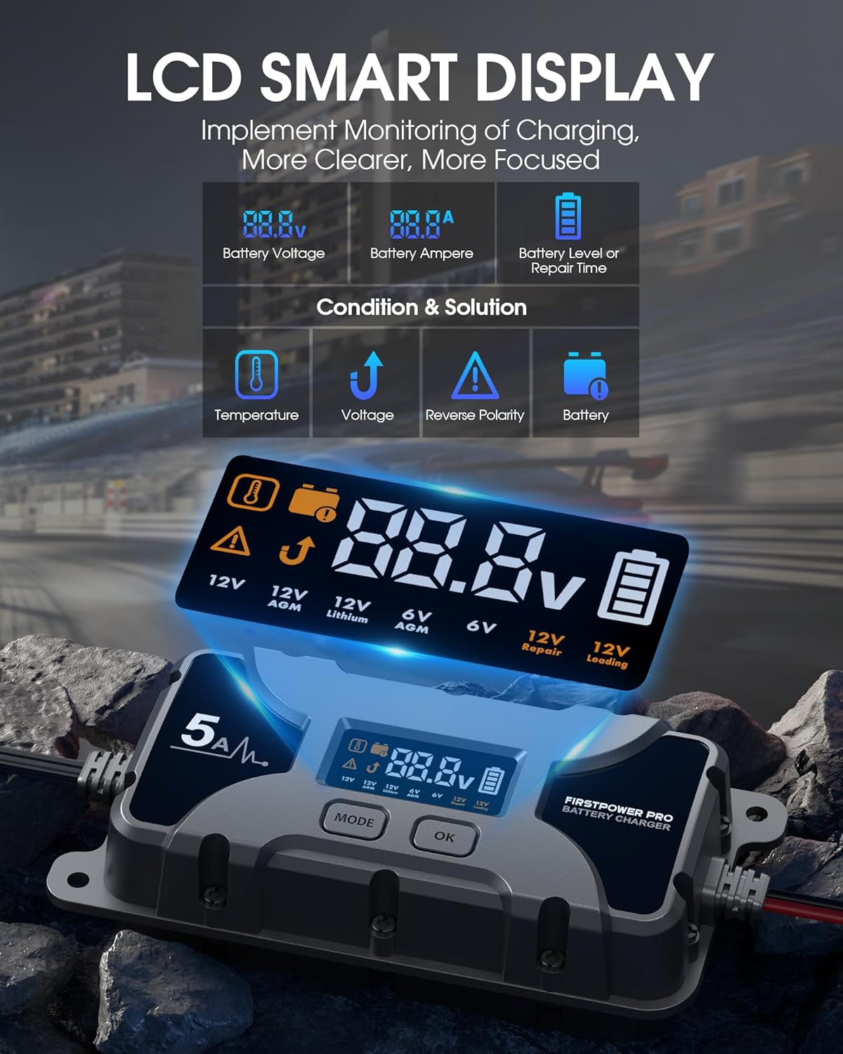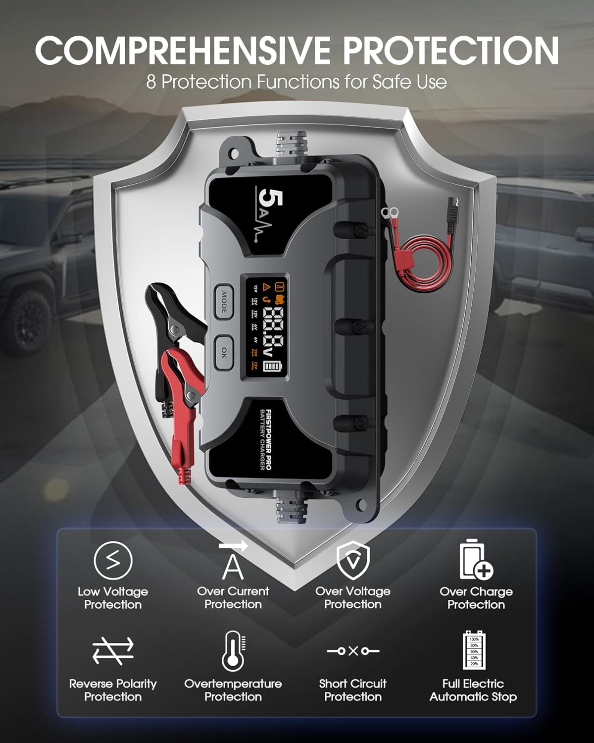 Note: Trickle charger for car battery 12v Firstpower Pro Upgraded 5A portable car battery charger, just better. It’s 34% smaller and delivers over 65% more power. (Fast charging: Charge 50Ah 12V to 80% in ~10hrs!!)