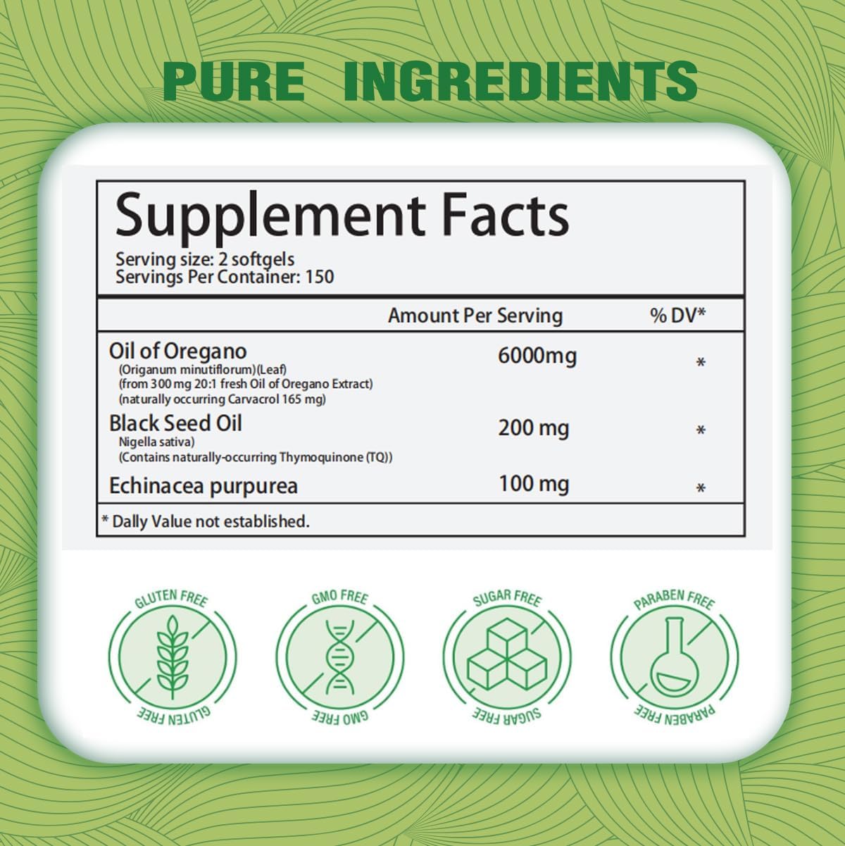 3-in-1 Oregano oil softgels, each serving of oregano oil softgels contains 6000 mg of oregano oil, 200 mg of black seed oil, and 100 mg of echinacea extracts that work together to promote body balance.