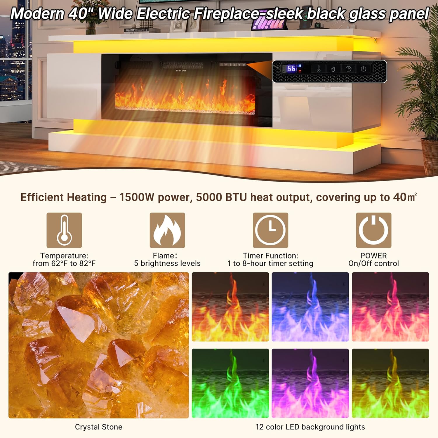 40“ wide crystal electric fireplace: The 40” fireplace is equipped with tempered glass, adjustable temperature (62°F-82°F), 1-8 hour timer, digital thermostat and 1500W heating power, covering an area of up to 40 square meters (5000 BTU heat output). The crystal stone bed enhances the atmosphere, while the remote control and overheat protection ensure convenience and reliability. It is a reliable choice for year-round comfort and modern home decor