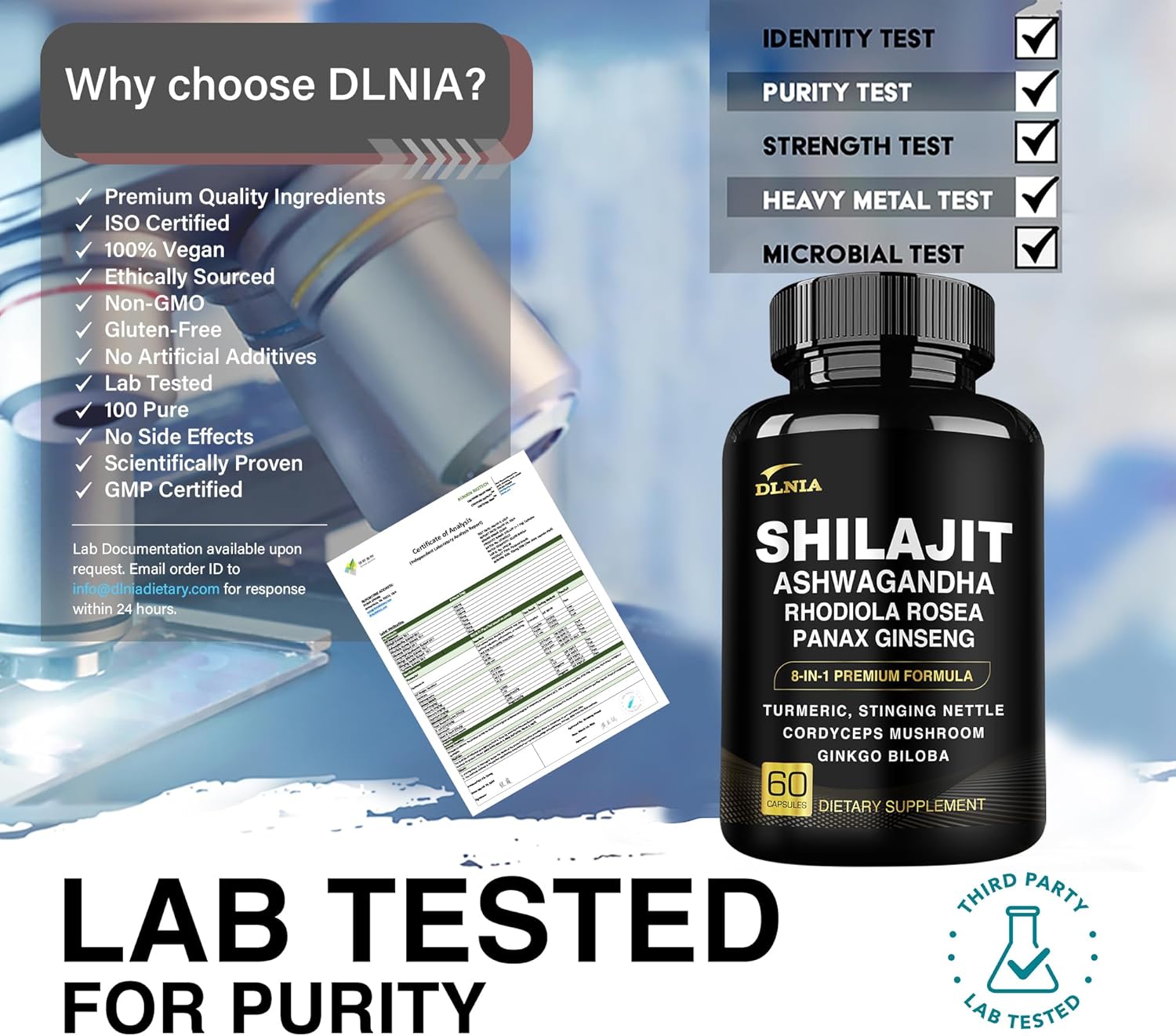 💪SATISFACTION GUARANTEE WITH EVERY CAPSULE: Harvested from the ancient Himalayas & meticulously blended with 7 potent, natural ingredients, our DLNIA 8-in-1 Shilajit Supplement is proudly formulated, tested, & certified here in the USA; we hold our product to the highest standards of quality, & efficacy; Your Health & satisfaction are our priorities, so rest assured that our shilajit premium capsules are free from impurities & preservatives