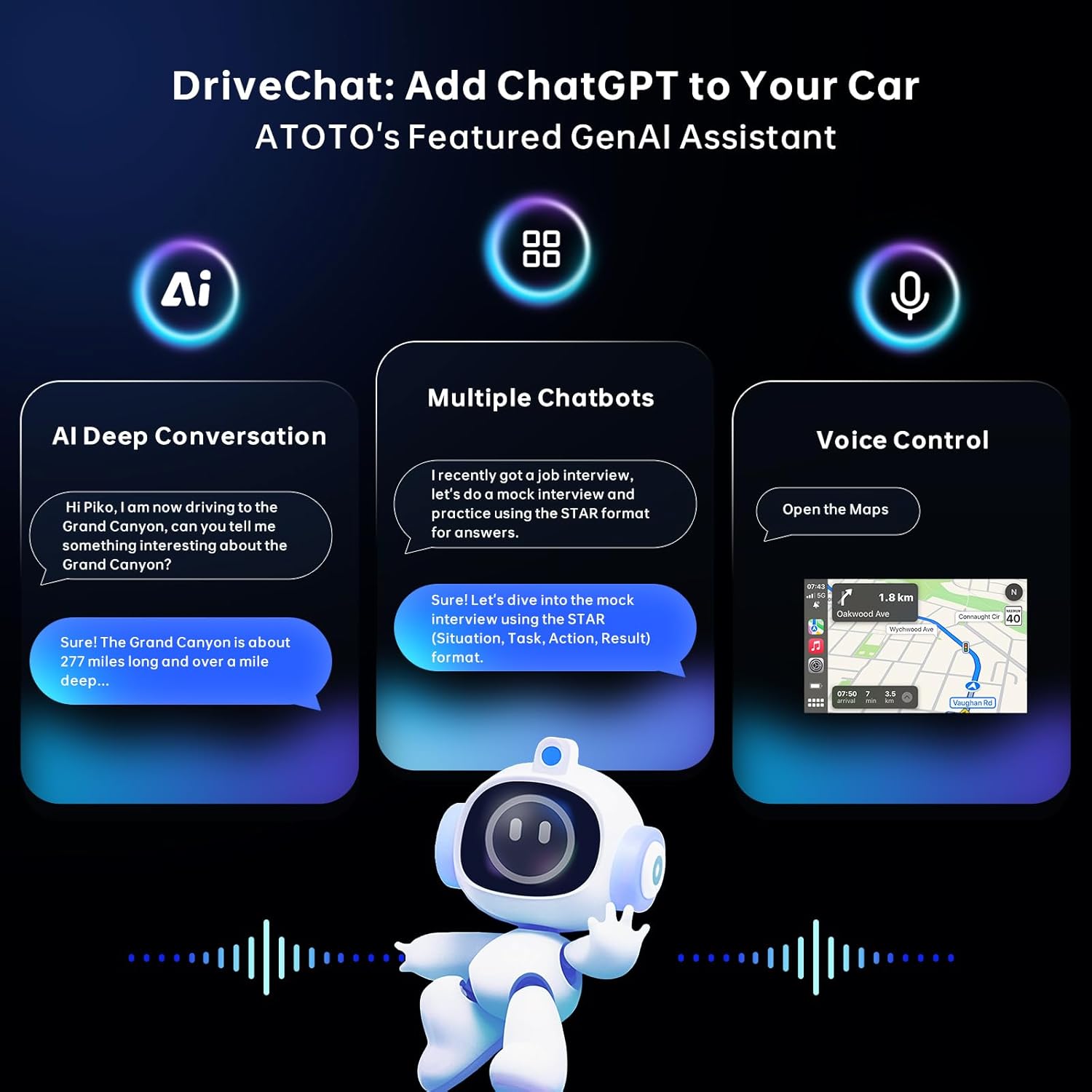 [DriveChat – New AI Driving Assistant] Based on the ChatGPT model, DriveChat is a cutting-edge app in car stereo screen, designed to enhance driving fun and safety with AI Power. Wonder a unique fun driving experience? Try DriveChat! you can engage in various interactions and take control through voice commands—answering calls, playing music, and more. Check out different chatbot roles for a driving companion, such as professionals, philosophers etc! Customize the wake-up words to your liking!