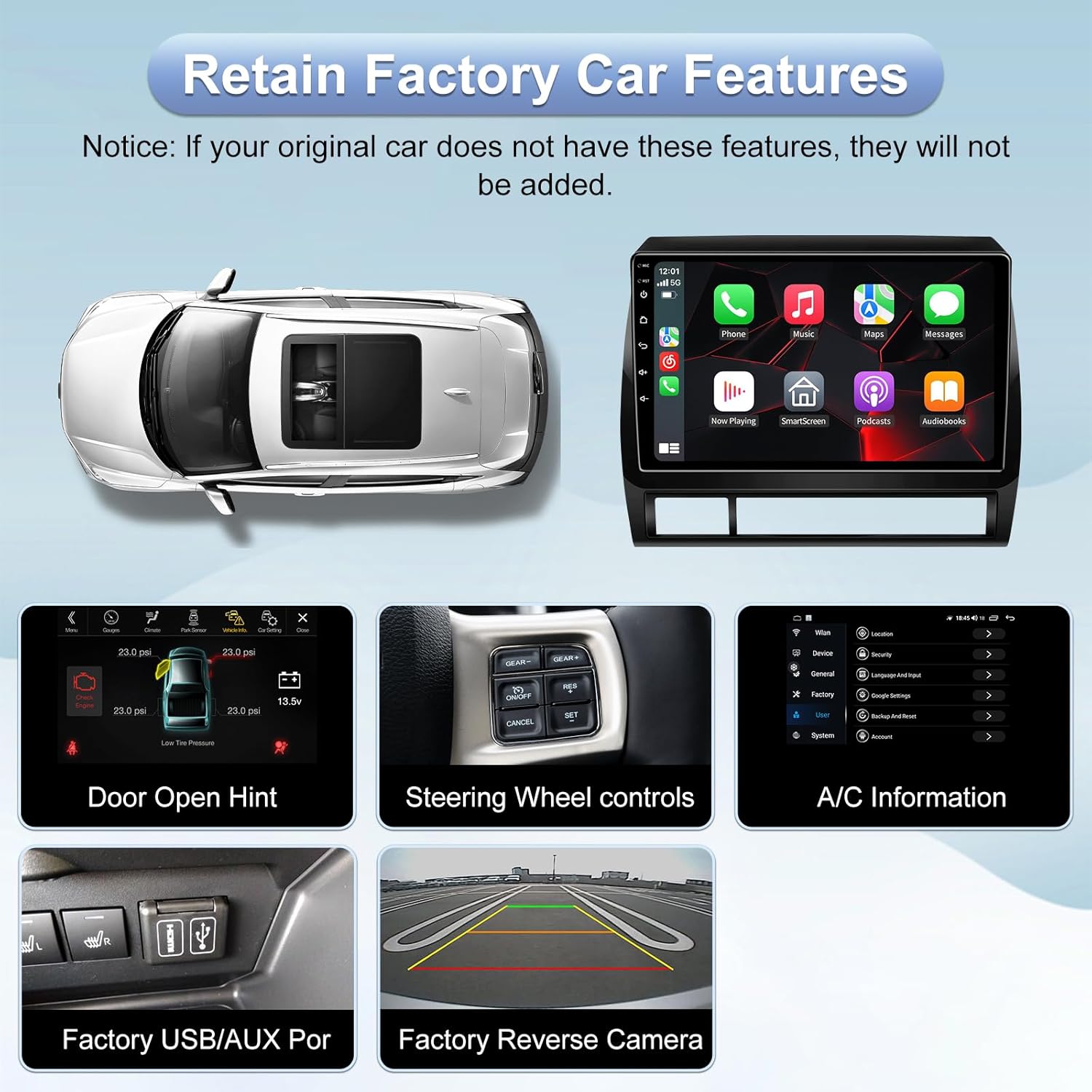 【Perfect Fit for Toyota Tacoma 】Our Car Stereo is designed specifically for Toyota Tacoma 2005 2006 2007 2008 2009 2010 2011 2012 2013 2014 2015. It comes with a comprehensive plug-and-play kit that includes all necessary components for installation.It even retains the factory steering wheel controls, reverse camera, and factory antenna adapter.