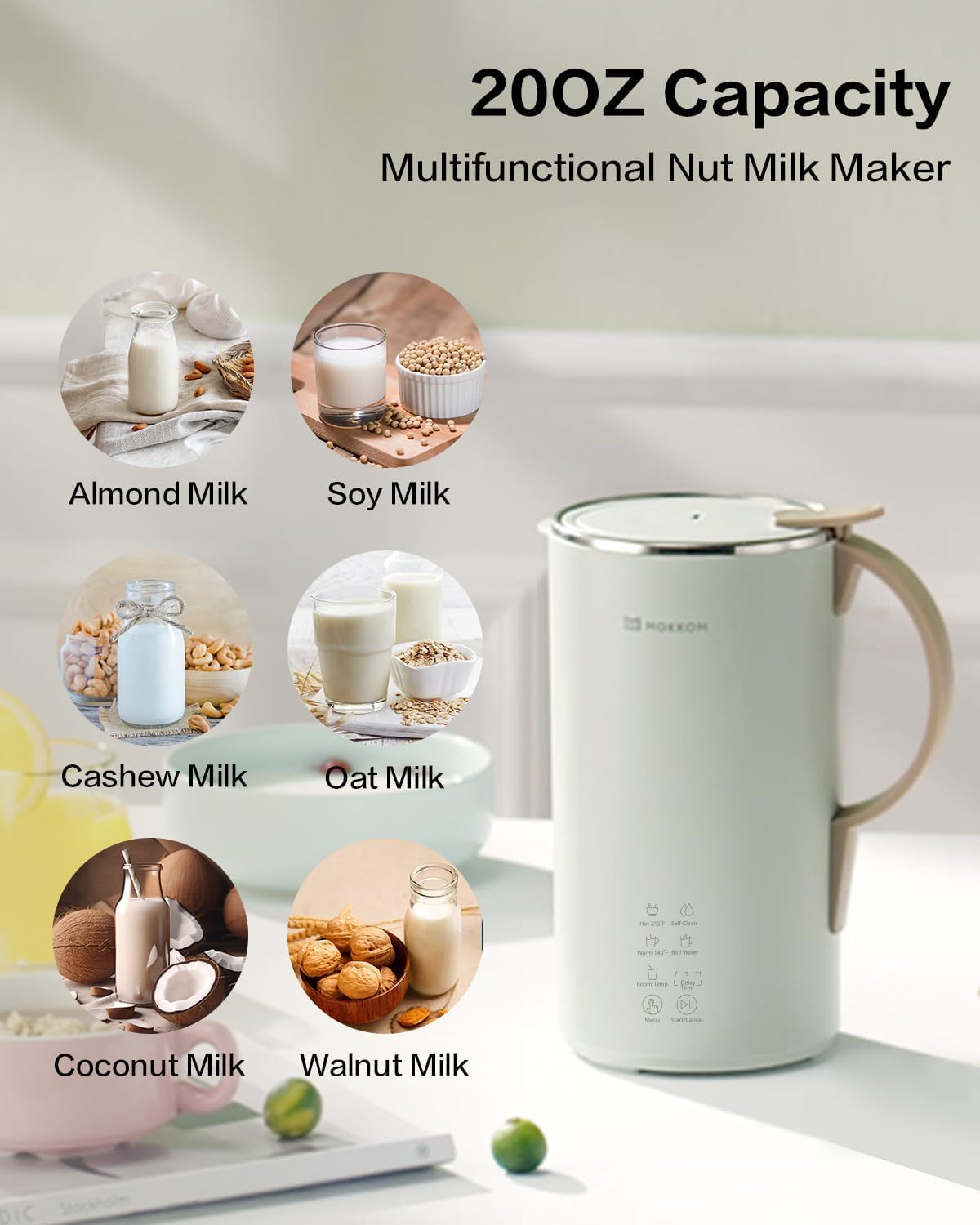 【Multi-function Automatic Program】MOKKOM nut milk maker can skip the soaking process, easy to make various plant-based milk. The Room Temperature setting is specially used for almond milk, juicer, and other chilled nut milk; Warm (140℉) for warm beverages like oat milk; Hot (212℉) for making soy milk, rice milk, and hot chocolate. Moreover, it has Boil Water and keeps warm for 2 hours, Self-clean for a 90s rinse cycle and saves you time