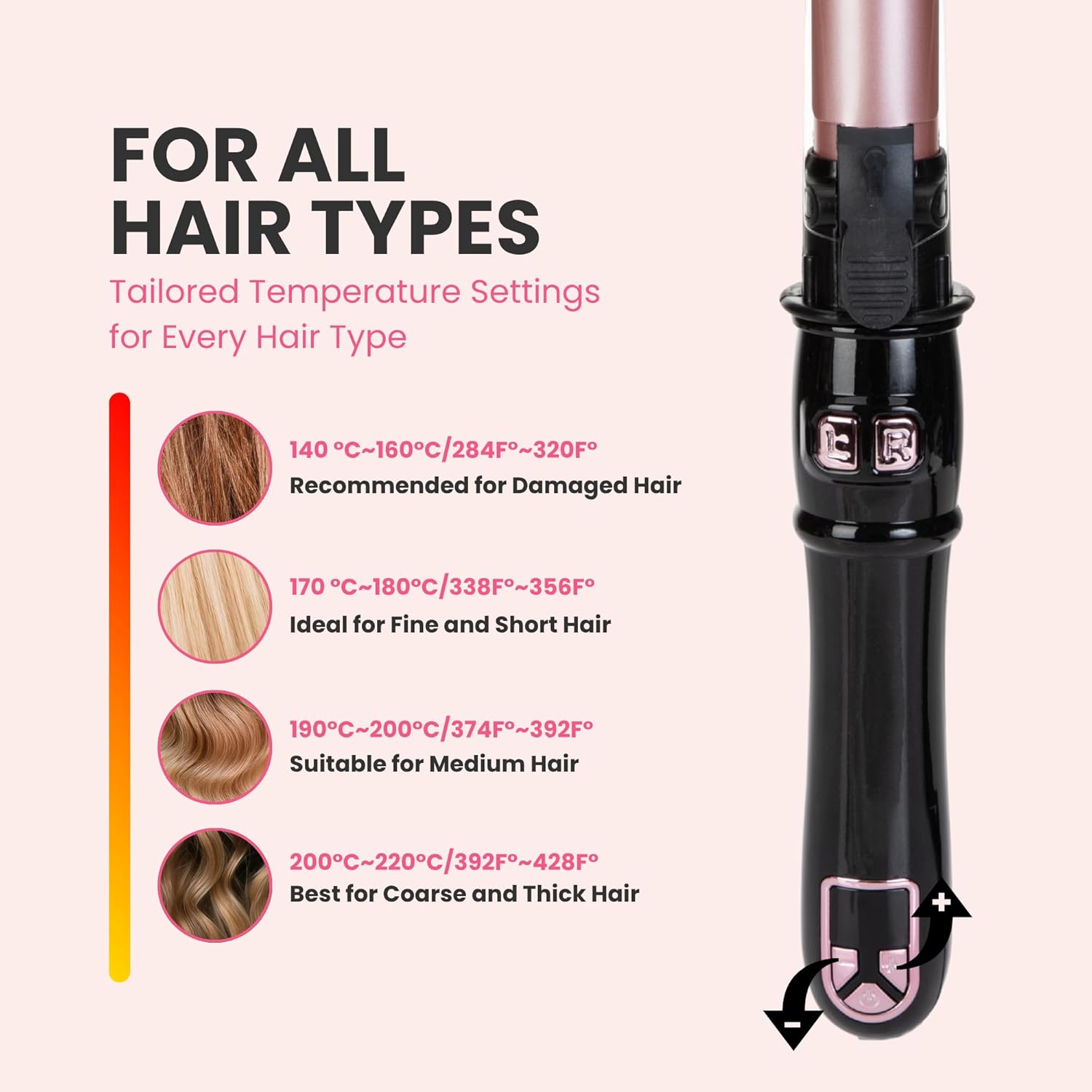 ADJUSTABLE TEMPERATURE CONTROL FOR CUSTOM STYLING – Customize your styling with multiple heat settings designed to suit your unique hair type. Minimize damage while maximizing style, perfect whether you prefer soft, gentle waves or tighter curls.