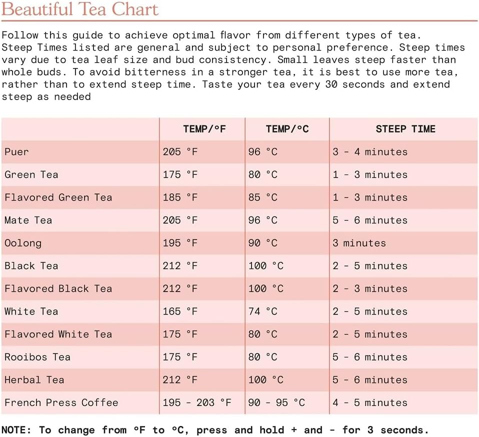 4 Preset Programs: Achieve the perfect brew with one-touch temperature settings for white, green, oolong, and black teas.