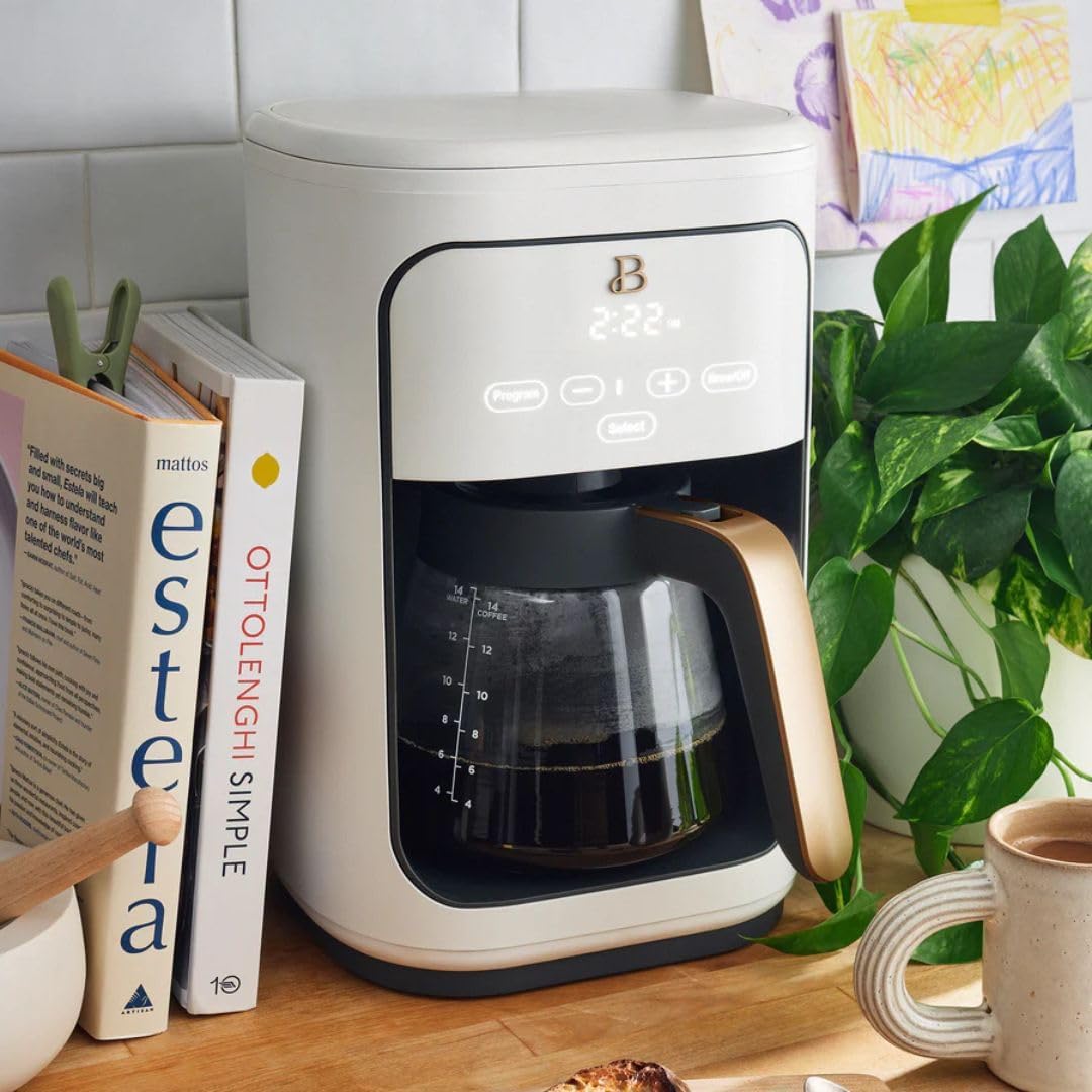 Beautiful Drew Coffee Maker, 14-Cup Capacity, Programmable with Touch-Activated Display, 1200W Power, Stainless Steel Finish, 24-Hour Brew Timer, Auto Shut-Off – White Icing