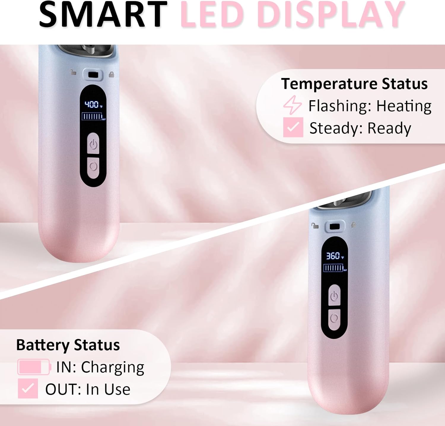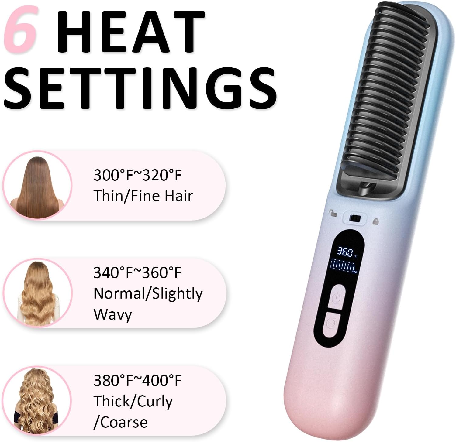 ⚡ Fast Charge & Heat Up: 65W Type-C charger fully recharges in 30 mins (3x faster than other rechargeable hair straightening brushs). Heats up in 30 seconds to 6 adjustable temps (300°F-400°F) for all hair types (thin, thick, curly, coarse).