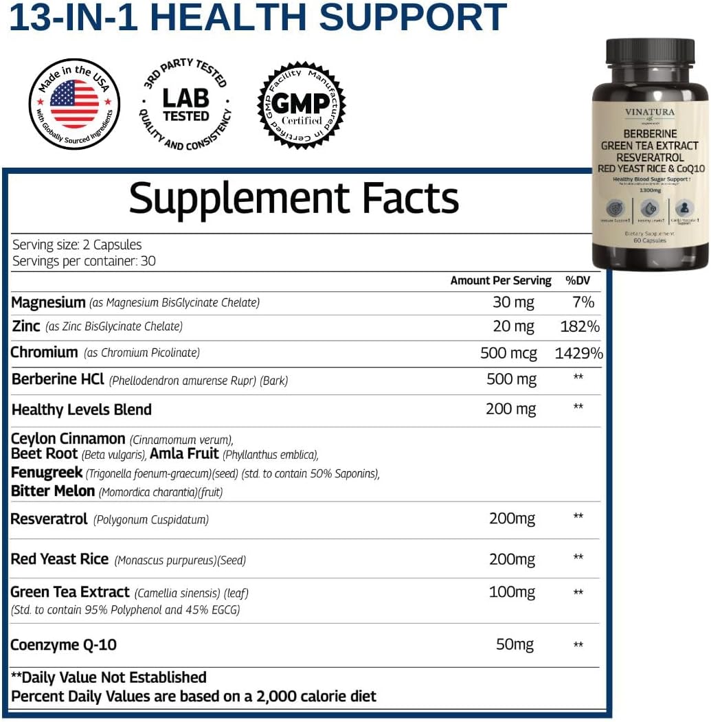 13-IN-1 FORMULA – a comprehensive formula combining Berberine with Ceylon Cinnamon, Red Yeast Rice with CoQ10, Resveratrol, Fenugreek, Amla plus Bitter Melon, Beet Root, EGCG, and Magnesium Bisglycinate, Zinc Glycinate, Chromium Picolinate. Experience the remarkable results of this 13-in-1 formula, meticulously crafted by Vinatura to promote overall immune.