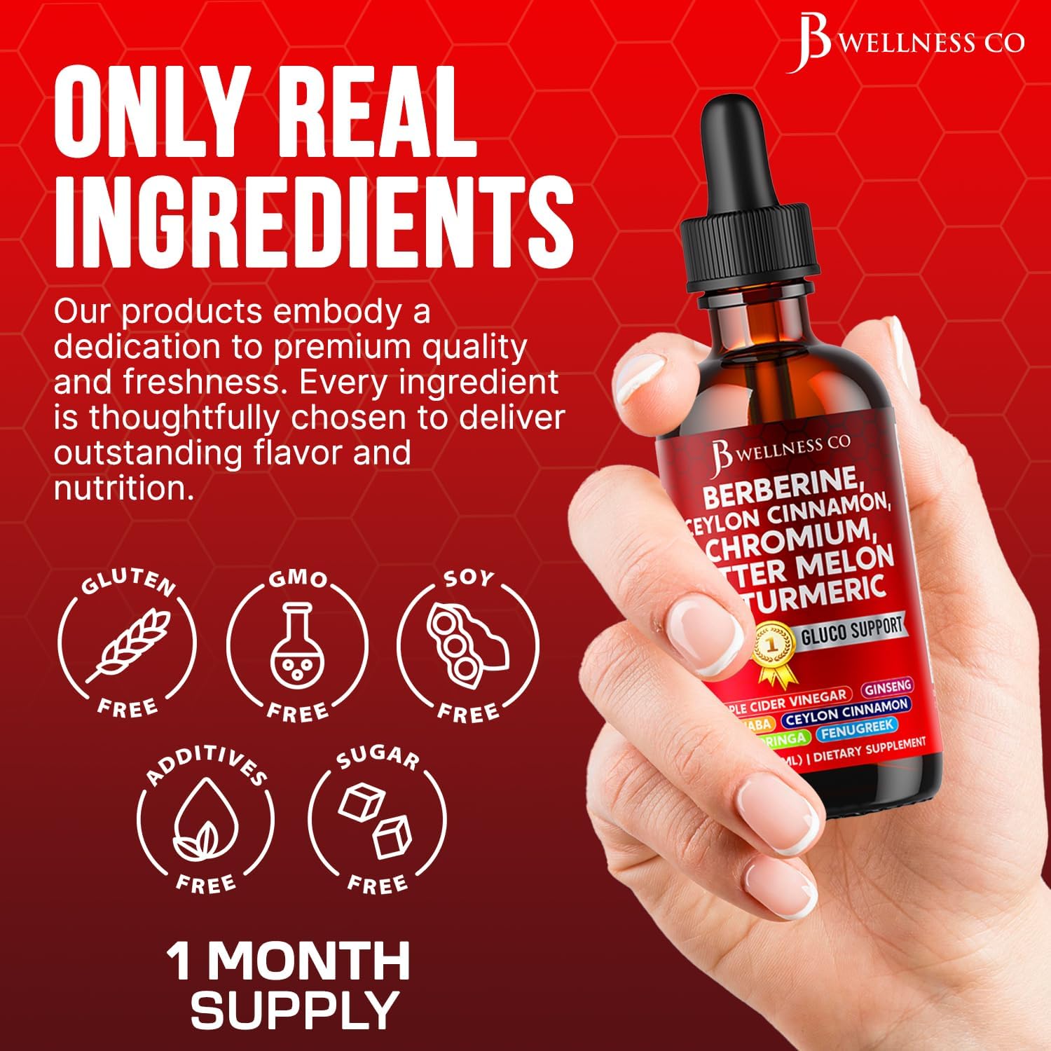 Berberine with Ceylon Cinnamon Supplement Liquid Drops + Bitter Melon Extract, Glucomannan, Gymnema, Chromium, Turmeric, Panax Ginseng, Moringa- 4 OZ