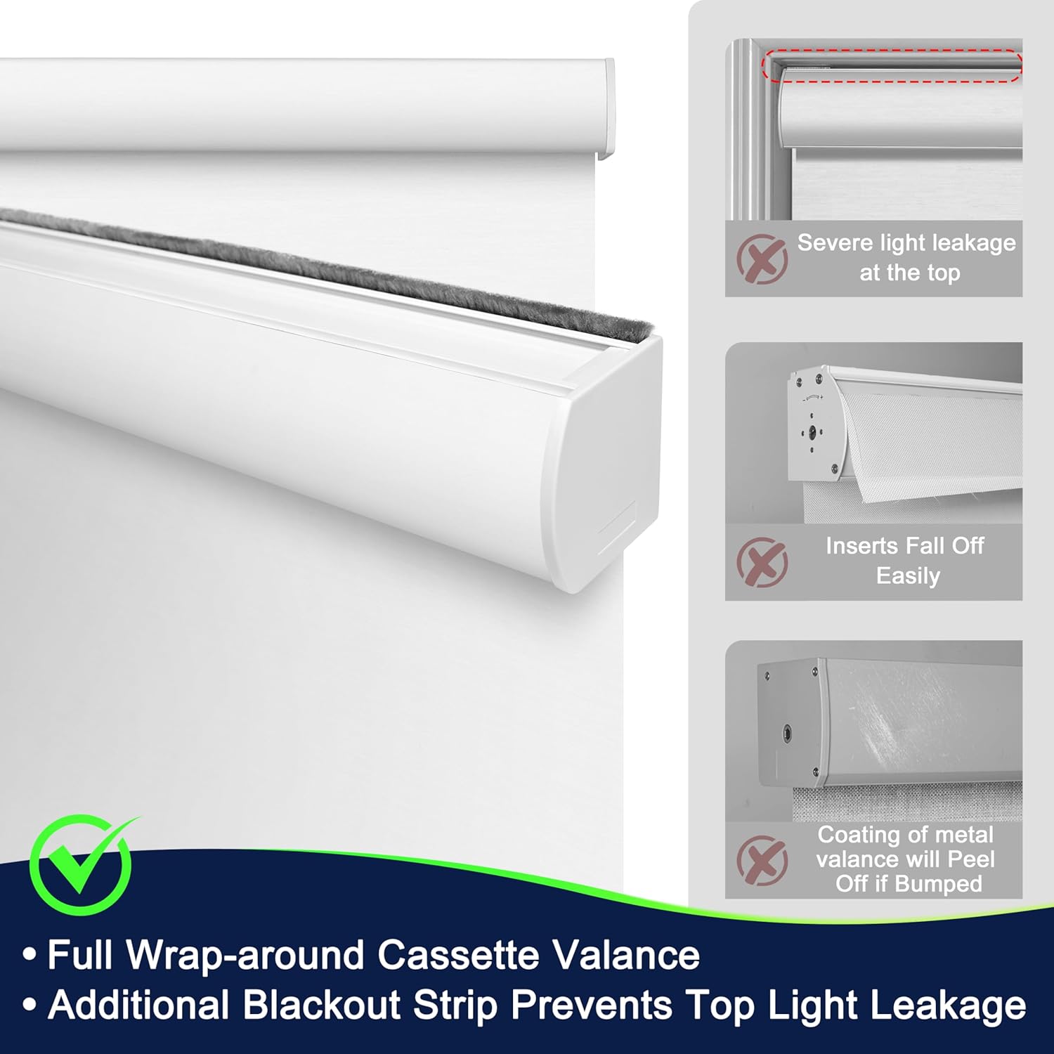 【Full Wrap-around Cassette Valance】The fabric wraps around the metal frame, making the valance and the fabric a whole, which looks more simple and beautiful.In order to solve the problem of easy light leakage at the top,the Blackout strip is added at the top of electric roller shades, and it is installed on the outdoor side of the valance, so that it can’t be seen from the front, and won’t affect the overall aesthetics