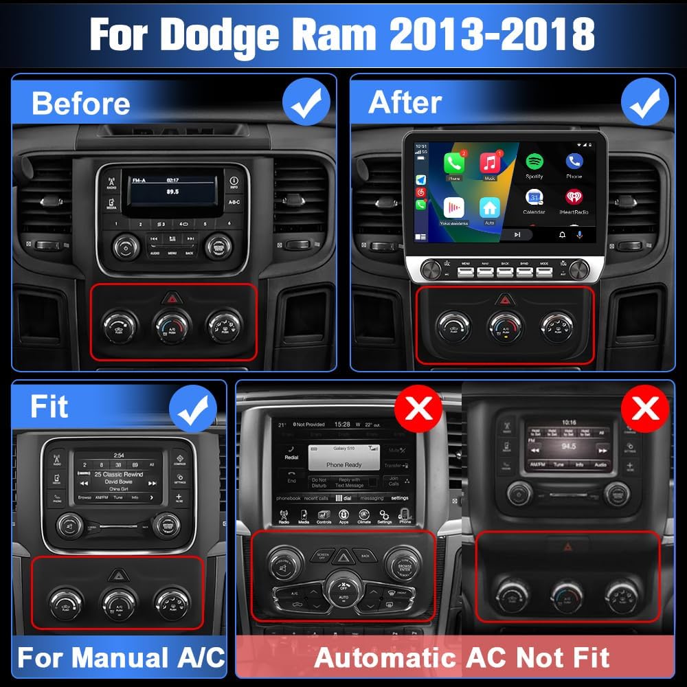 【Radio Compatible for Dodge Ram 2013-2018 1500 2500 3500 Only fit Manual AC】10.1 inch HD 1080P capacitive touch screen radio, with Android 13 system, has 2GB RAM and 64GB ROM (Many similar radios are 16GB ROM), can be used for Dodge Ram 2013-2019 1500 2500 3500, it comes with all the cables and frame you need, please check these years before you buy. (Including CAN-BUS)
