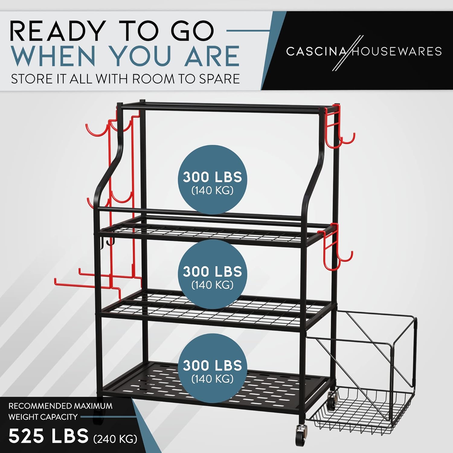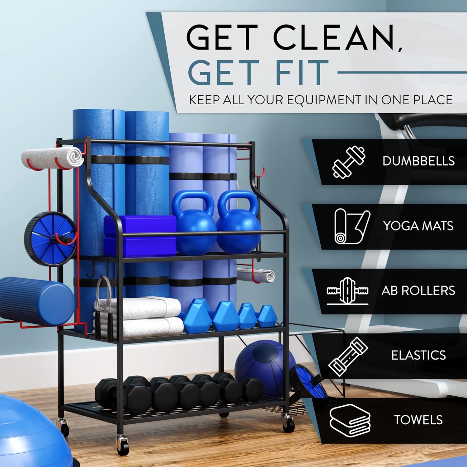 Cascina Home Gym Storage Rack – Weight Rack for Dumbbells, Kettlebells, Foam Roller, Resistance Bands and Yoga Mat Storage Holder – Exercise Workout Equipment Storage Organizer with Hooks and Wheels