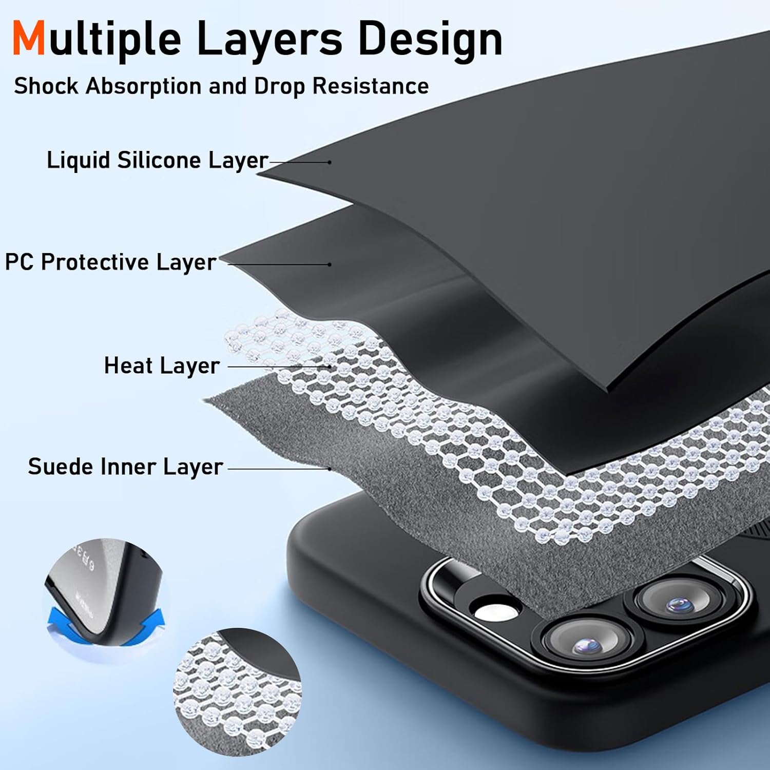 Military-Grade Drop Protection : Features a multi-layer design including a shock-absorbing silicone layer, a protective PC layer, and heat dissipation technology for maximum protection against drops from up to 3 meters.