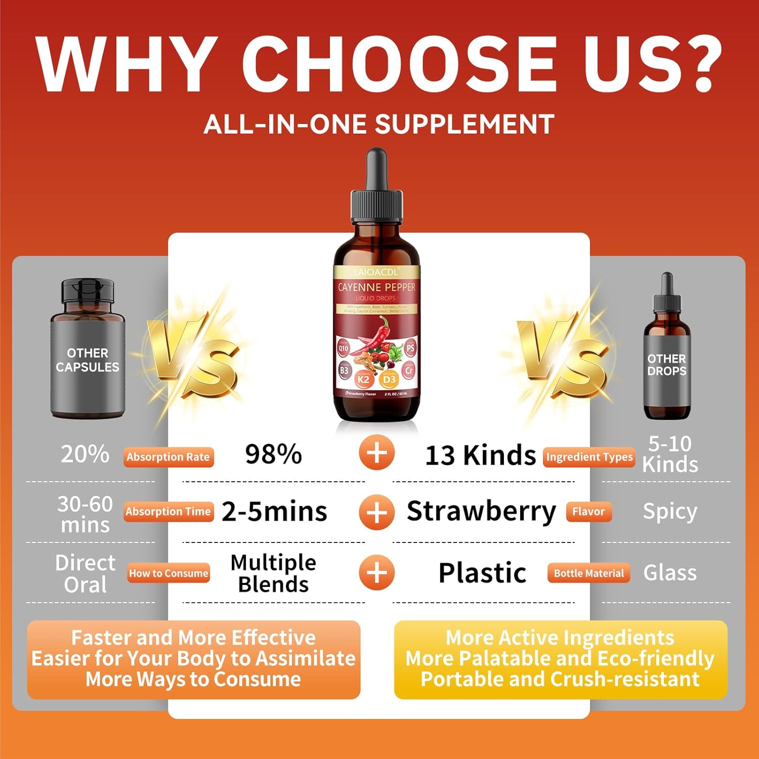 【13 Supplements in 1 Bottle】Cayenne Drops contain 13 supplements:Vitamin D3, Vitamin K2, Vitamin B3, Chromium, Coenzyme Q10, Phytosterols,Cayenne, Hawthorn, Beet, Turmeric, Panax Ginseng, Berberine, Ceylon Cinnamon. Support your system,health and holistic balance.