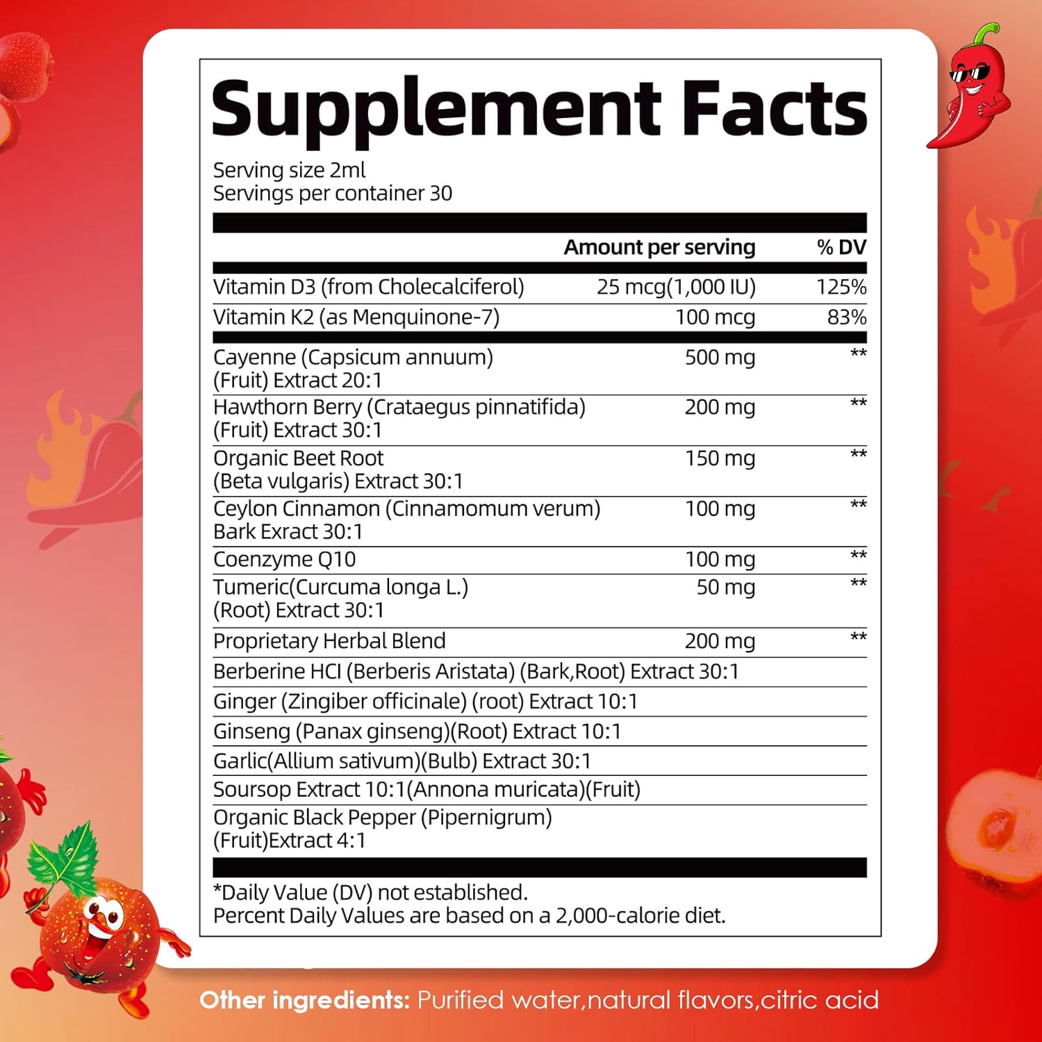 Cayenne Pepper Drops Supplement Liquid with Vitamin D3 K2, Hawthorn Berry, Organic Beet Root, Ceylon Cinnamon, Coenzyme Q10, Berberine, Ginseng Extract Supports Immune Health, 2 FL.OZ
