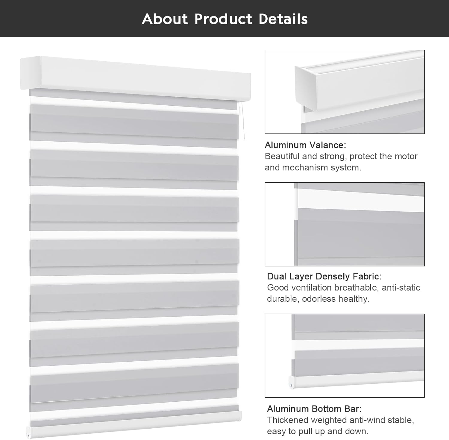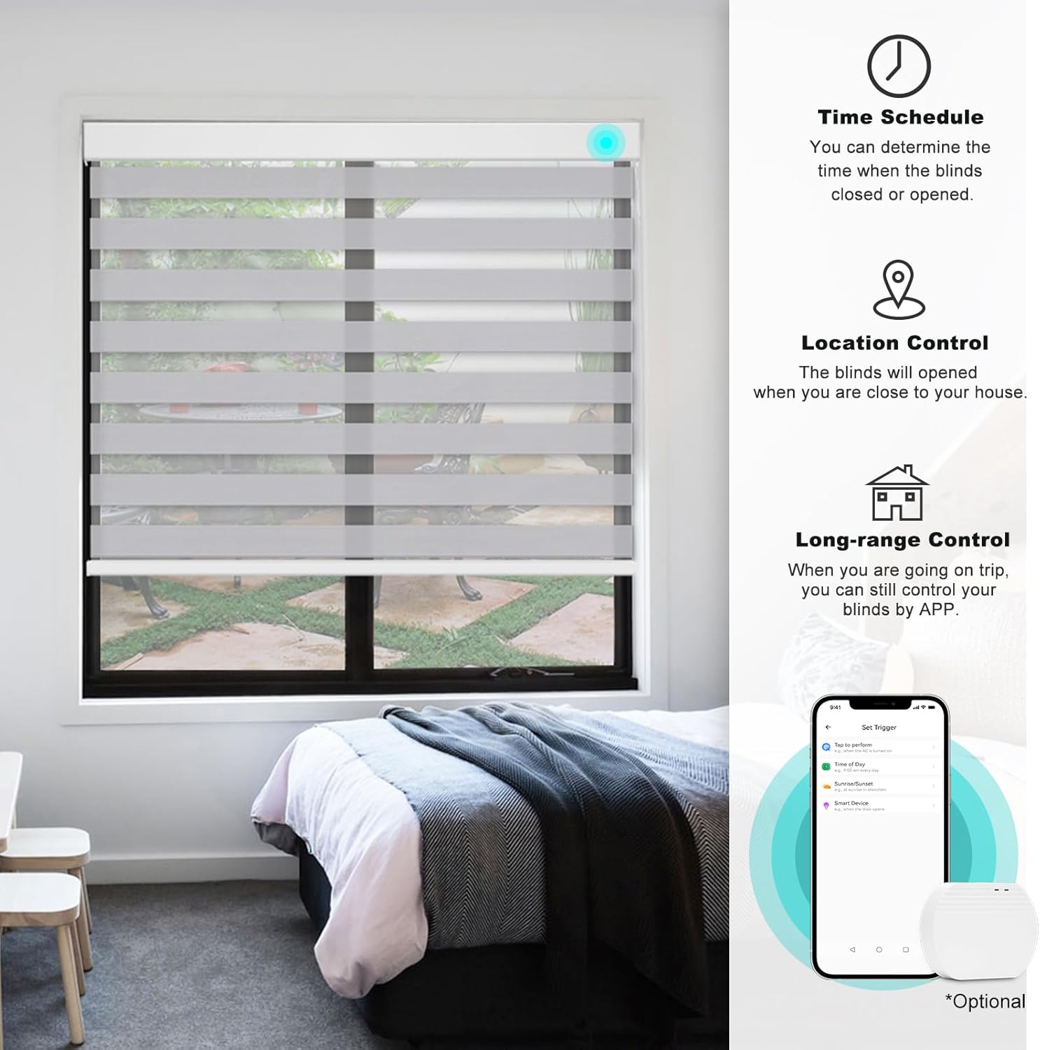Custom Motorized Blinds Intelligent: You can select motor to match your devices on Customization Page.Our smart zebra blinds make it possible to regulate the incoming natural daylight and sunlight.This helps to control the indoor climate and save energy, by taking full advantage of the reflective and insulating properties of window covering fabrics, creating the perfect atmosphere at any time of the day.Once programmed, the blinds run automatically.