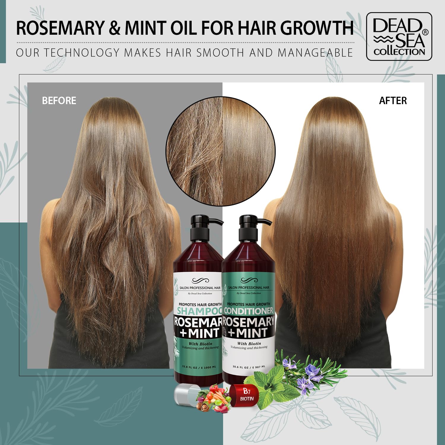 Dead Sea Collection Shampoo and Conditioner Set for Strengthening and Volume – Pure Dead Sea Minerals, Rosemary and Mint – Nutrition, Repair and Shine – Pack of 2 (33.8 & 30.6 Fl. Oz)