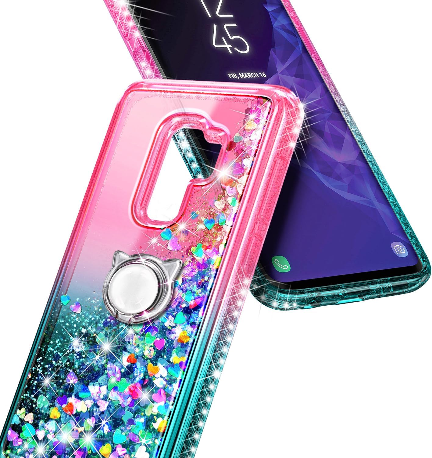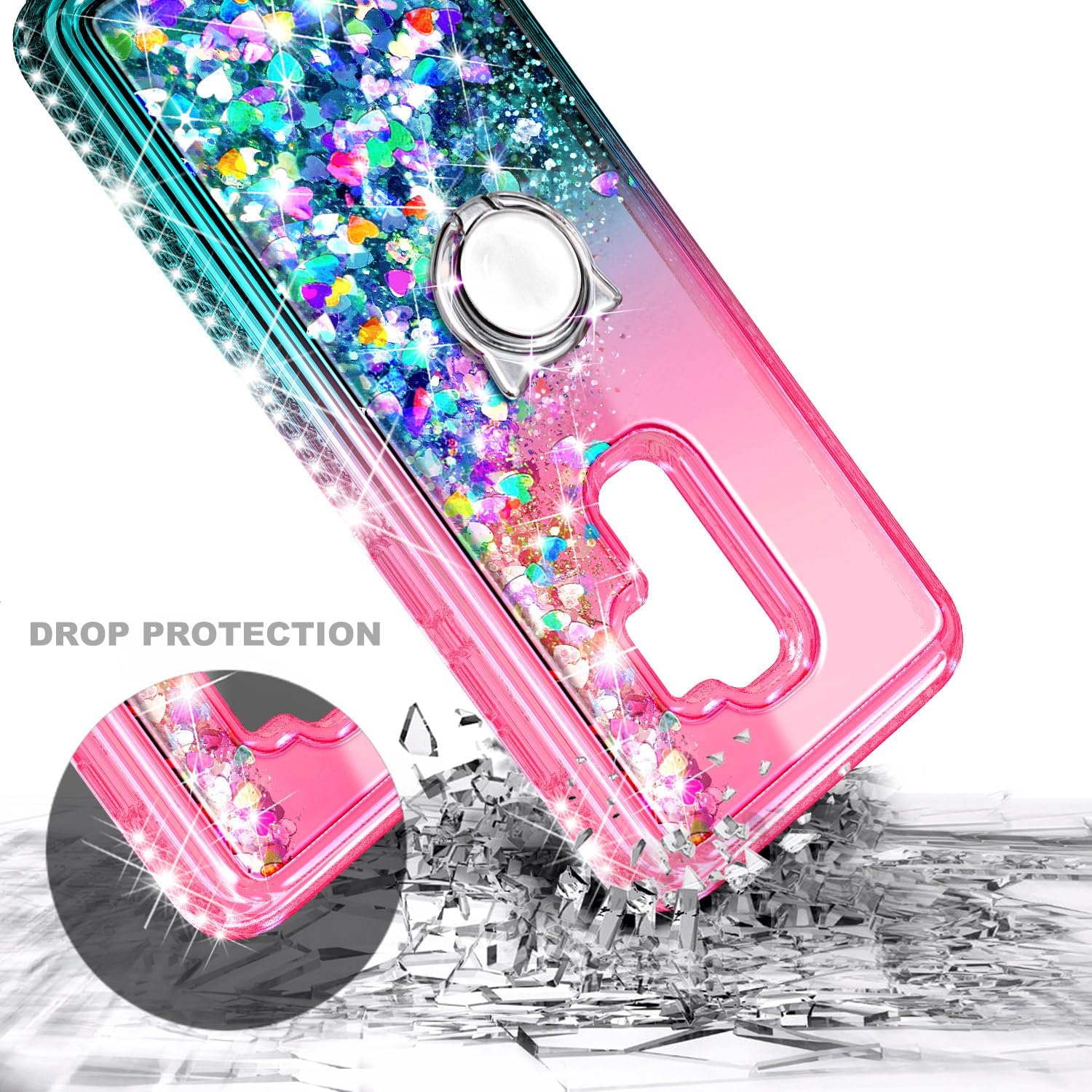 Designed for Samsung Galaxy S9 Plus Phone Case with Screen Protector (Maximum Coverage, Flexible TPU Film)/Ring Holder/Wrist Strap, Sparkle Glitter Floating Liquid Cute Case, Pink/Aqua