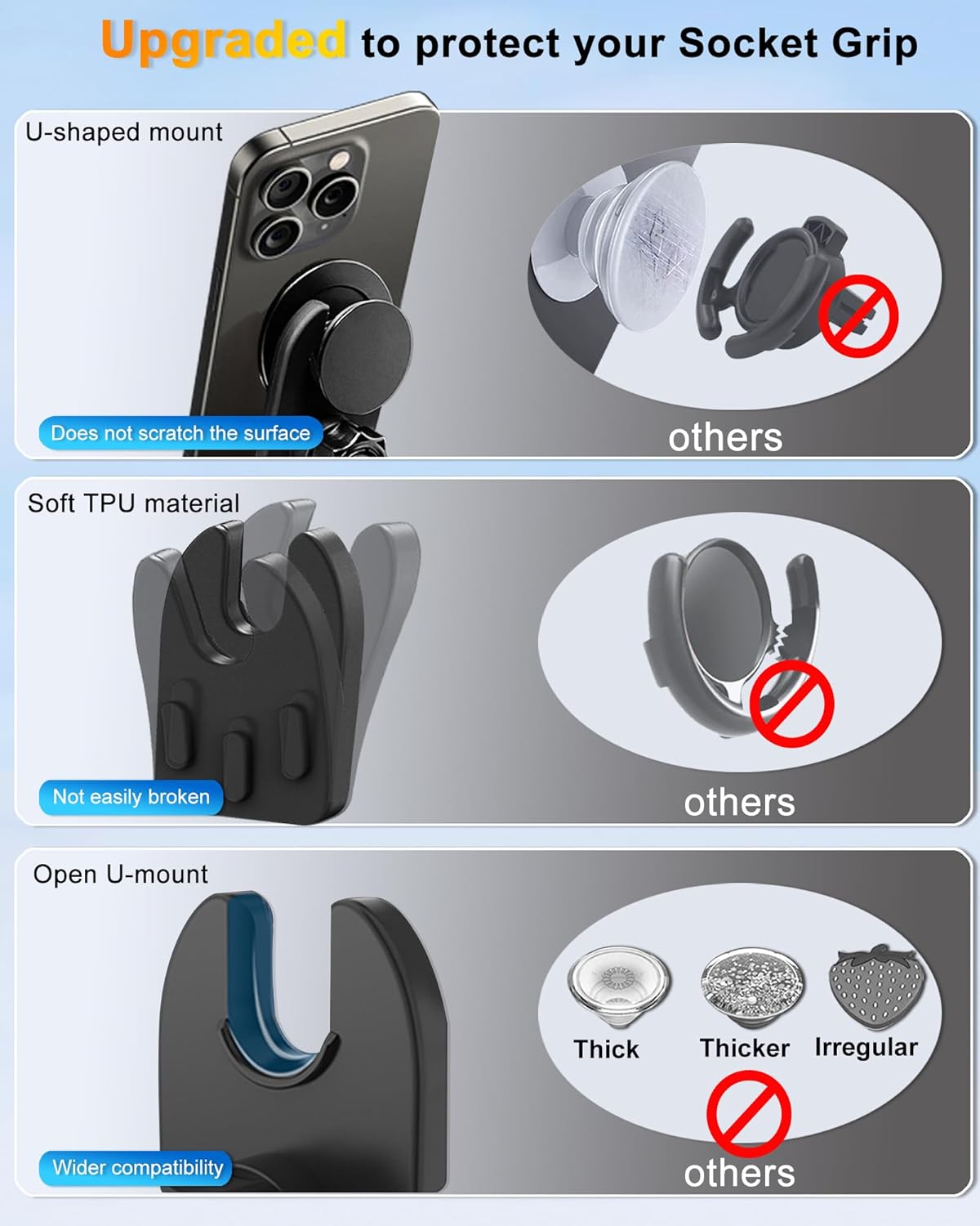 Friendly for 99% Socket Grip: The U-shape mount compliments socket grips construction, pefectly fits for pop socket mount and holds your smart phone upright without flipping. Note: the mini collapsible socket grip is incompatible