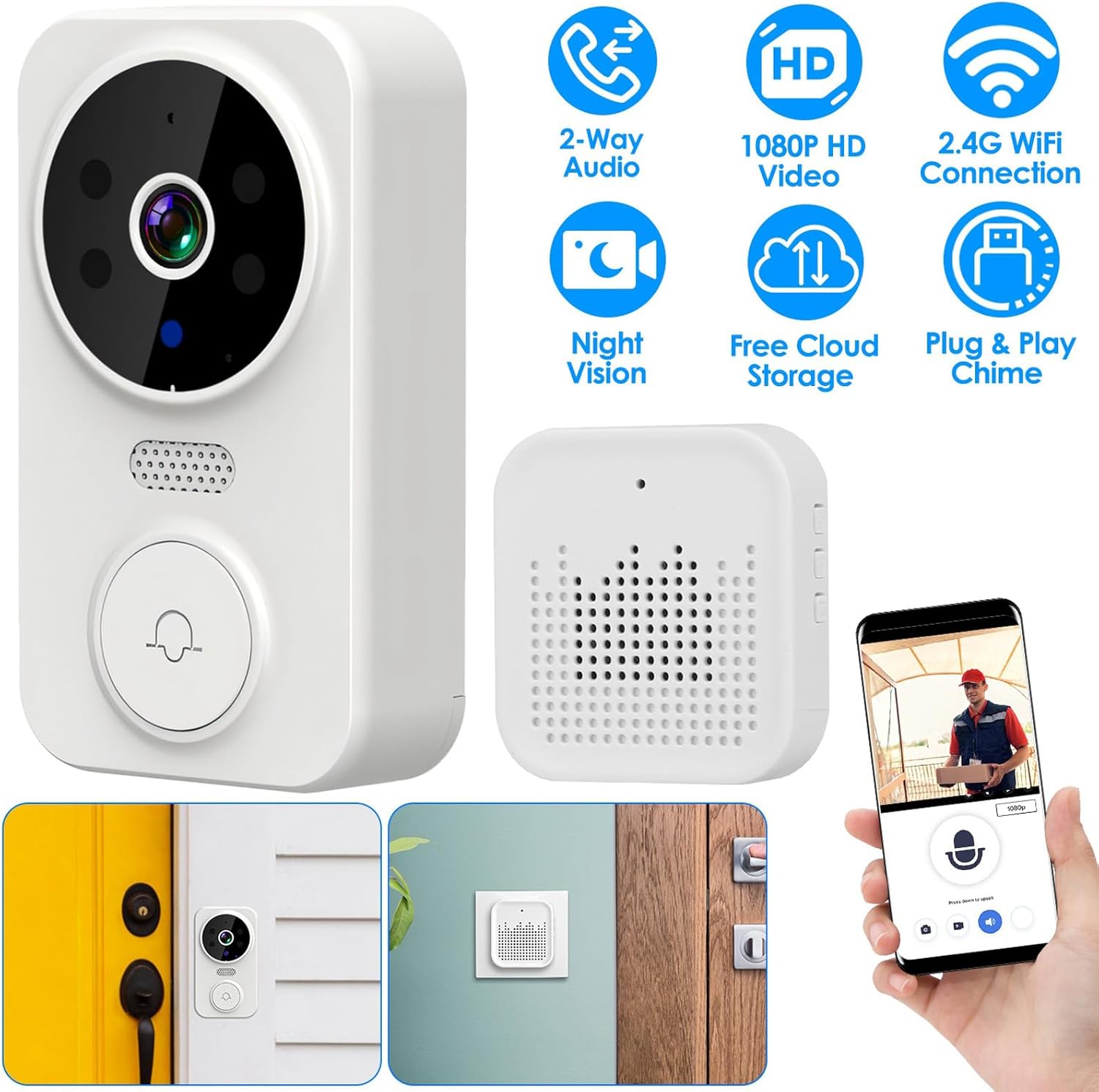 Doorbell Camera Wireless, 1080P Smart Wireless Video Doorbell Camera with Chime, 2.4GWiFi, 2-Way Audio, Night Vision, Free Cloud Storage Security Doorbell for Home Office, White