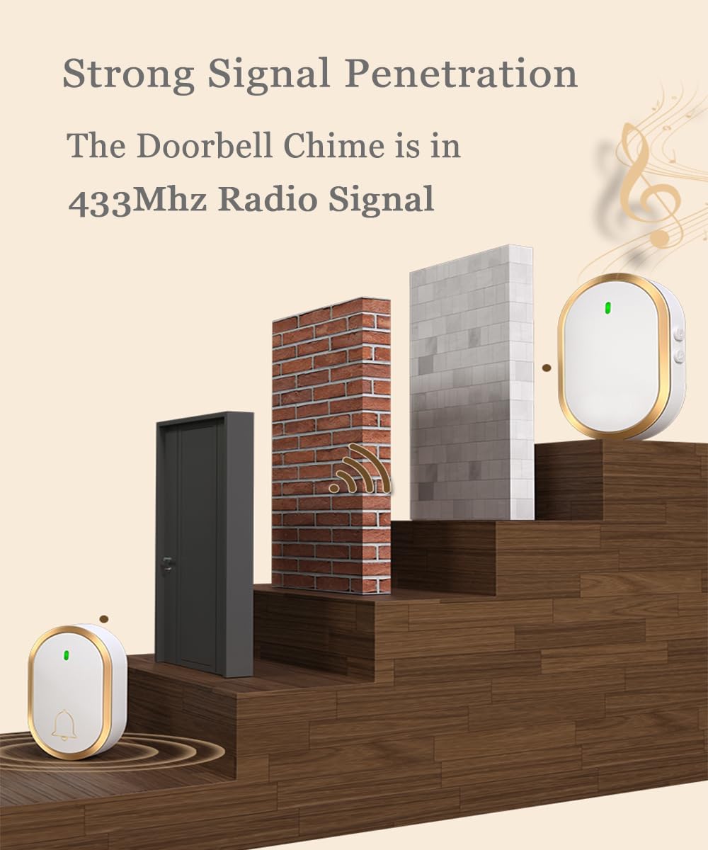 [Long Wireless Doorbell Range]: The reveiving distance is long, up to 1000ft Range in open area. This wireless doorbell transmitter and receiver adopts FM signal, no need wired which has strong anti-interference features and one-to-one signal pairing