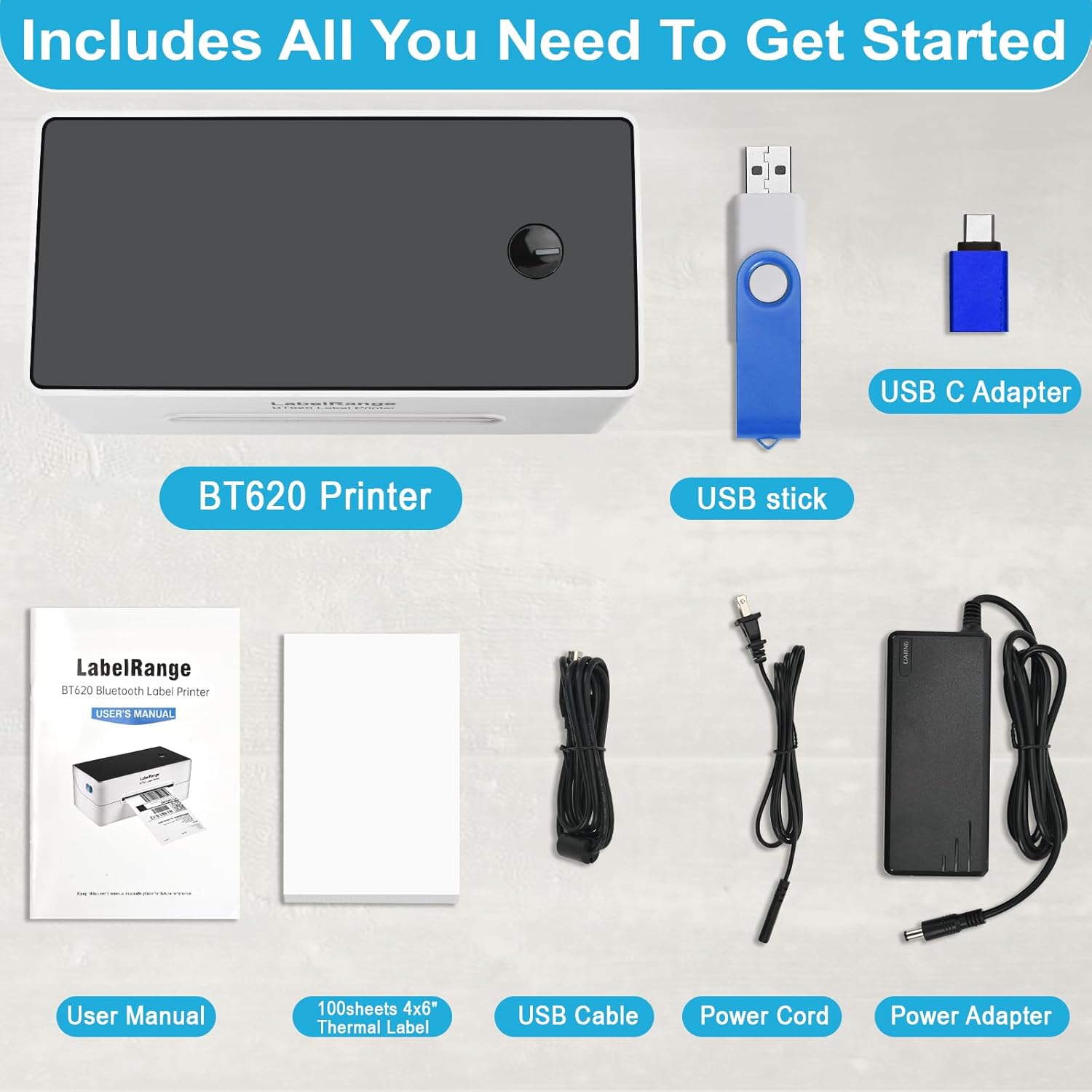 COMPREHENSIVE BUNDLE: The BT620 printer package comes with everything you need for a seamless label printing experience. It includes the BT620 printer, power adapter, power cord, USB cable, USB disk (includes driver software), USB-C adapter (for computers without a USB port), 100 sheets of 4×6” label paper, and a color user manual. We’ve been providing expert support since 2019, and we appreciate the opportunity to help you. Most problems can be resolved in just 10 minutes. Thank you.