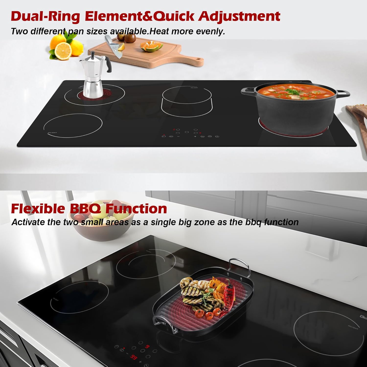 【Suitable for All Cookware 】36 inch ceramic cooktop is suitable for all kinds of cooking pans, iron, aluminum, ceramic, stainless steel, copper and heat resistant glass.