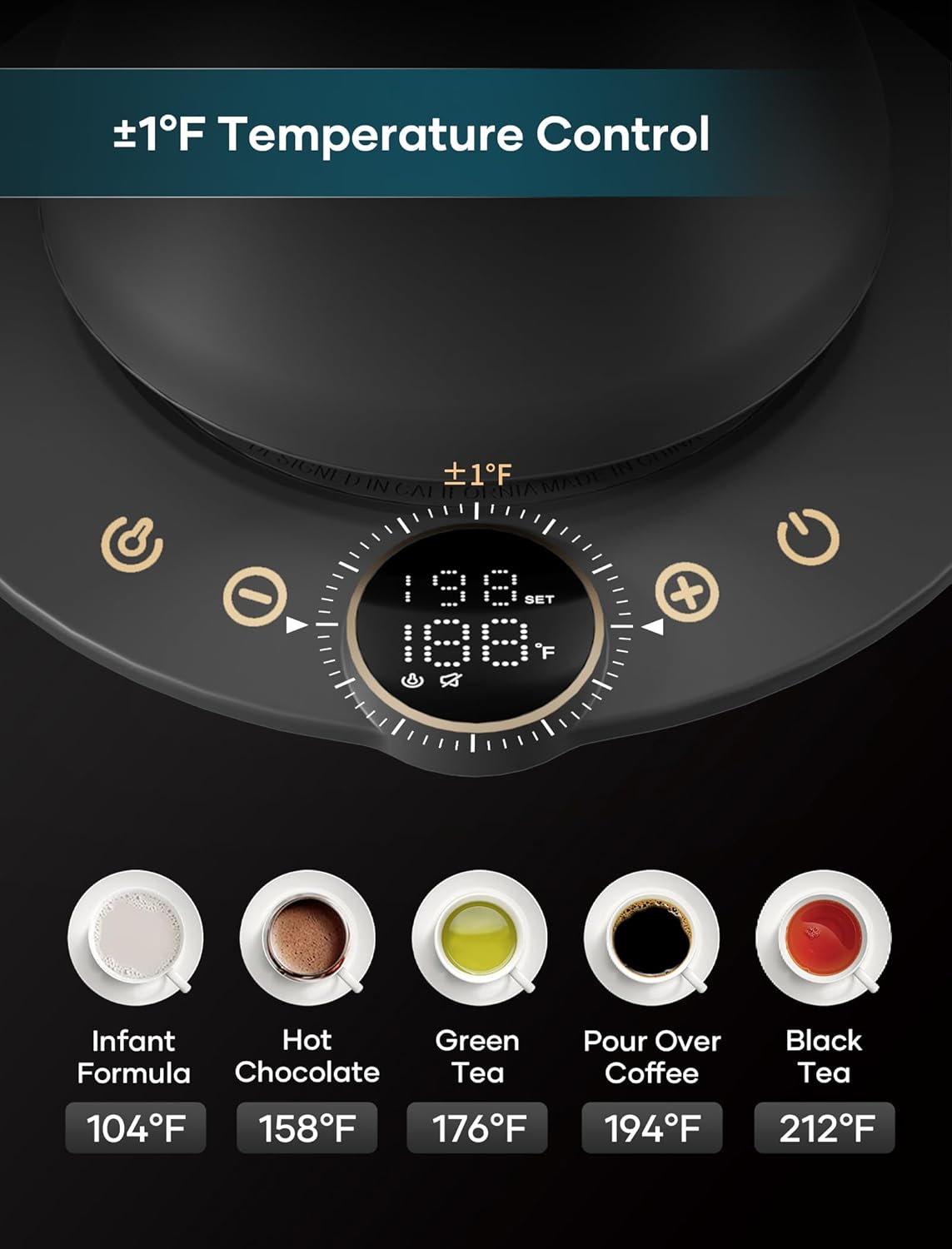 ±1℉ Temperature Accuracy – The intelligent base’s built-in temperature control program. The program will adjust the heating power when the water temp approaches the desired temp according the temp probe detects the temp change.